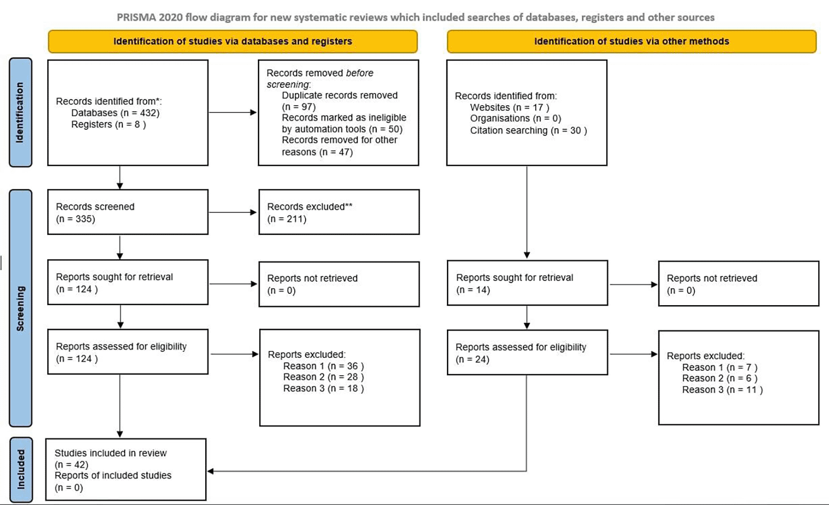 The PRISMA 2021 flow diagram ( Figure 4) summarizes the search and screening process, including the number of records identified, screened, excluded, and finally included in the systematic review. Figure 4 presents the study selection process following the PRISMA 2021 guidelines. A total of 432 records were retrieved from academic databases (Scopus, Web of Science, ERIC, and Google Scholar) and 8 from registers. After removing 97 duplicate records and 50 ineligible entries identified by automation tools, 335 studies remained for screening. Of these, 211 were excluded for not meeting the inclusion criteria (e.g., not related to TVET or not situated in Indonesia). Full-text assessment was performed on 124 reports, resulting in 42 studies that met the eligibility criteria for final synthesis. The diagram demonstrates the transparency of the review process and aligns with international standards for systematic evidence synthesis (Page et al., 2021).