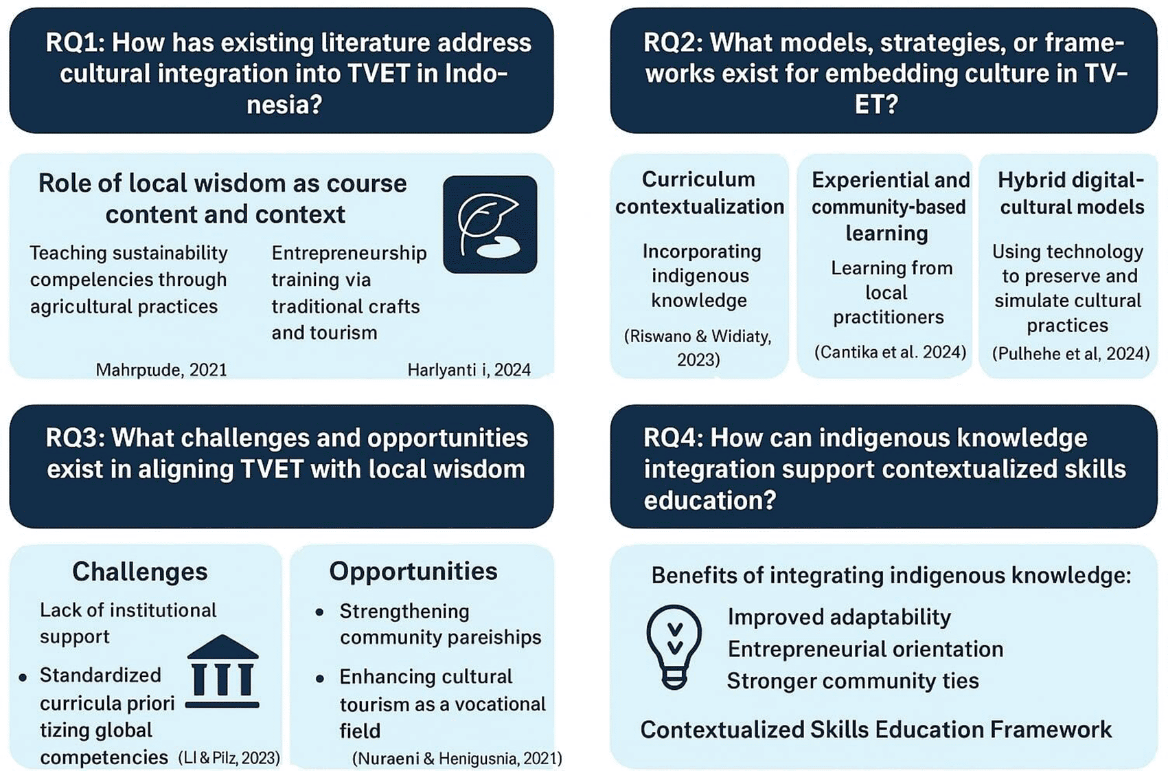This void indicates a critical space for research to systematically review and synthesize how TVET in Indonesia has embraced (or rejected) indigenous cultural incorporation, and promote TVET models that might bring together an integration of local traditions with modern vocational competencies. By addressing TVET and integrative into indigenous culture, the novelty in this article is it provides local wisdom not as impediments to modernization but shifts in thinking towards culturally relevant and sustainable vocational education.