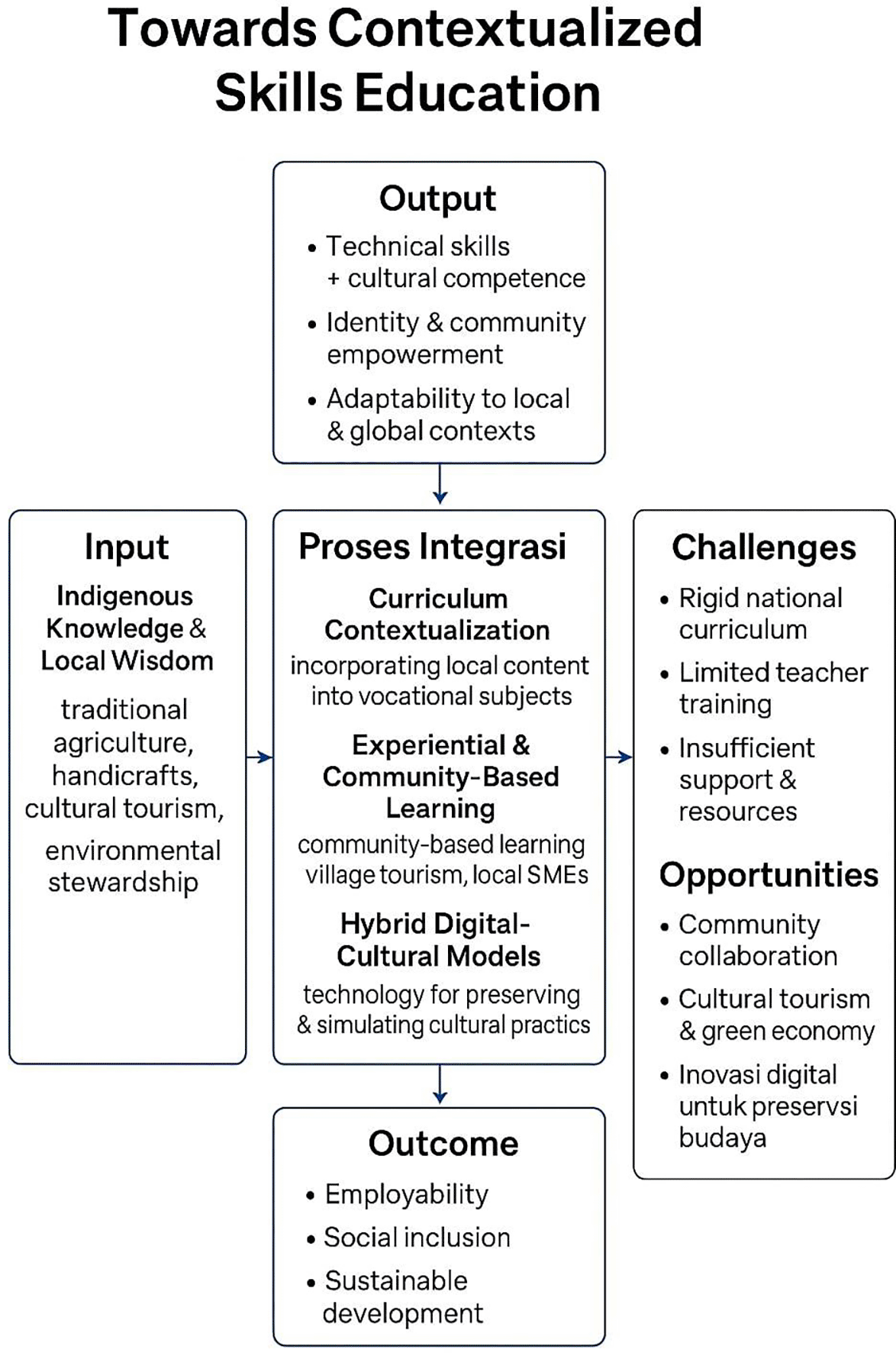 The statement above relates directly to the concept structure depicted in Figure 6. The visual provides a synthesis of how Indigenous knowledges and local wisdom are integrated with the global and industry do fresh knowledge base for vocational education reform. As the diagram indicates, these inputs are given reality through CRDs in the form of contextualising curricula and doing work experience or community service, hybrid digital-cultural configurations etc. Such paths are supported by empirical evidence: Bugis-Makassar farmers in South Sulawesi institutionalized integration of Indigenous and modern knowledge for rice farming decision-making through Tudang Sipulung forums, illustrating that tradition and skill can coexist in economically meaningful contexts (Limpo et al., 2022). Indonesian literature also shows that despite the growing discourse on digital capacity for TVET educators, a clear pattern of certification and policy direction does not yet exist, which hinders the spread of hybrid digital-cultural claim to learn strategy (Widaningsih et al., 2024). Moreover, the exploitation of ethnomathematics and local wisdom in SMK mathematics curricula represents specific examples showing how contextualized curriculum can improve students’ cultural resonance and their understanding of mathematics (Dhema et al., 2025).