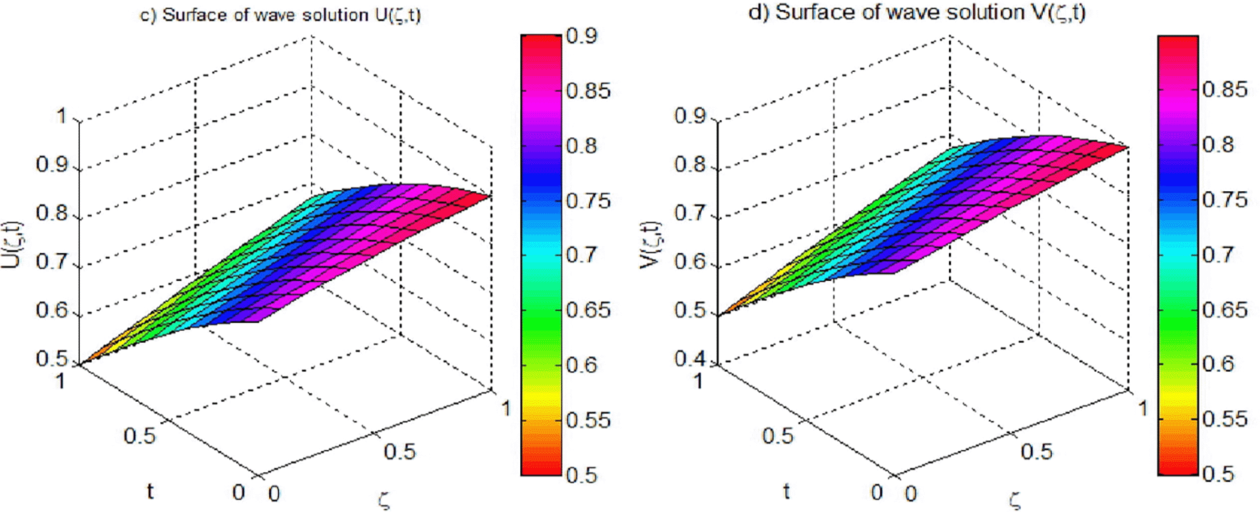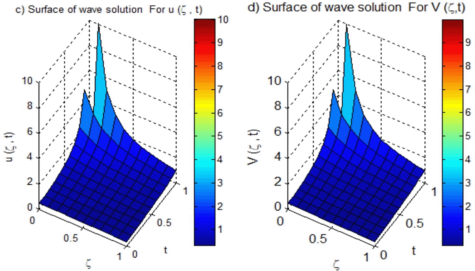 Example 5 illustrates the effectiveness of the proposed method in achieving lower error norms across various time steps and sizes. As it is showing in Table 13, at t = 0.1 with Δt = 0.01, the norm was , which was substantially lower than from.19 The results in Table 14 confirm that our method consistently yields lower and norms, particularly with finer time steps, demonstrating stability and robustness in simulating wave solutions. Also as it is shown in Table 15, the present method significantly reduces the maximum absolute errors compared to the method in,19 especially as M increases, demonstrating faster convergence. The errors decrease by several orders of magnitude across all parameters, indicating the superior accuracy and efficiency of the proposed approach. Based on this results, the present method outperforms the previous method in both accuracy and convergence rate. Figures 12 and 13 visually represent the behavior of the wave solutions and affirming the numerical findings.