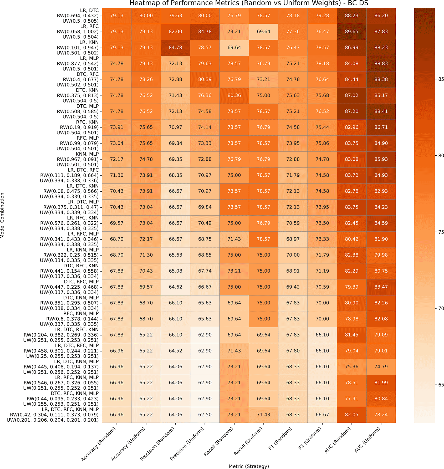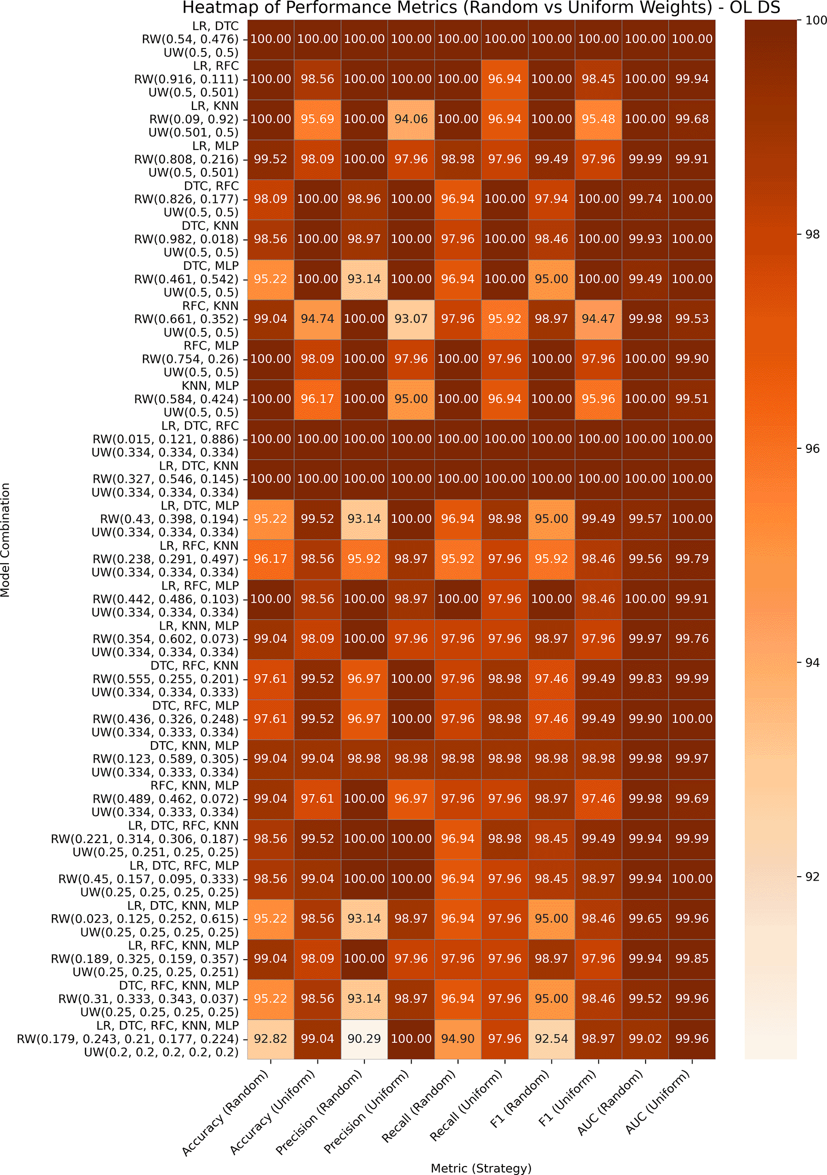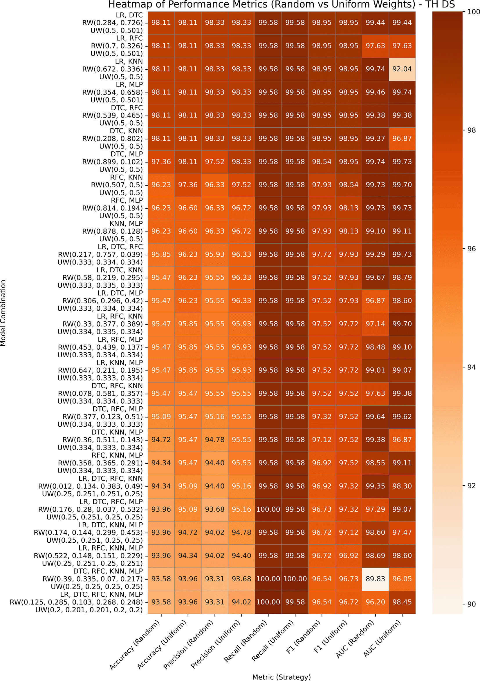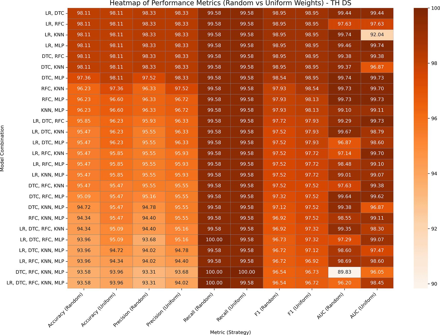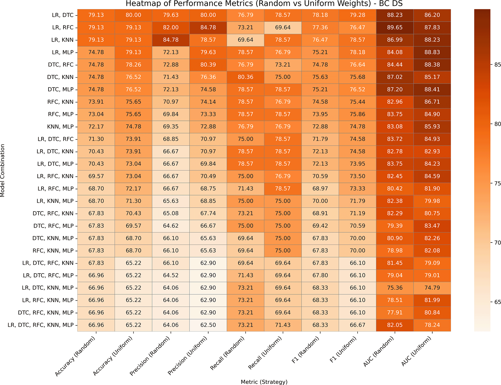Both variants performed exceptionally well, with accuracy and AUC values reaching or exceeding 99% across all combinations. In all GBWOEM-U pairs, weights are evenly distributed with minimal adjustment. Pair-like (LR, DTC), (LR, KNN), and (LR, RFC) algorithms continue to perform well, consistent with their performance across other datasets. For this dataset, the higher-order combinations (e.g., 5C3-5C5) perform well in the testing phase, and the training-testing accuracy gap is minimal, suggesting better generalization, possibly due to the nature of the attributes or the binary classification approach we employed.