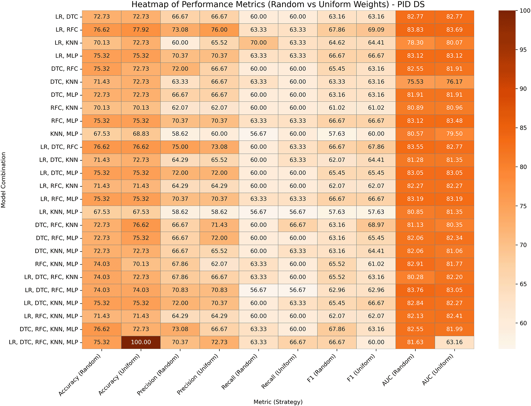 | Dutta et al.12 | Diabetes | GNB, BNB, RF, DT, XGB, LGB | Weighted Average | 73.5 | The AUC of the base models is taken as weight. |
