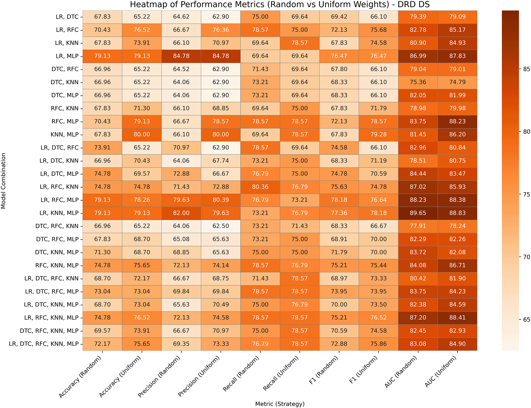 The Diabetic Retinopathy Debrecen Database, comprising 1,151 instances and 19 features, helps predict diabetic retinopathy using image-driven features. The performances of GBWOEM-R and GBWOEM-U are represented in Figure 5. In GBWOEM-R, (LR, MLP) (0.877, 0.542), (LR, RFC, MLP) (0.341, 0.433, 0.346), and (LR, KNN, MLP) (0.322, 0.25, 0.515) achieved the highest accuracy, whereas (LR, KNN, MLP) had the best AUC. From the final weight of each base model, it can be concluded that all models contribute significantly to the final result. The GBWOEM-U variant achieved slightly higher accuracy than GBWOEM-R, but had a lower AUC value. In this variant, (KNN, MLP) (0.501, 0.501) showed higher accuracy, where each model contributed equally. However, as per the AUC concern, the (LR, KNN, MLP) pair provides balanced results for both variants.
