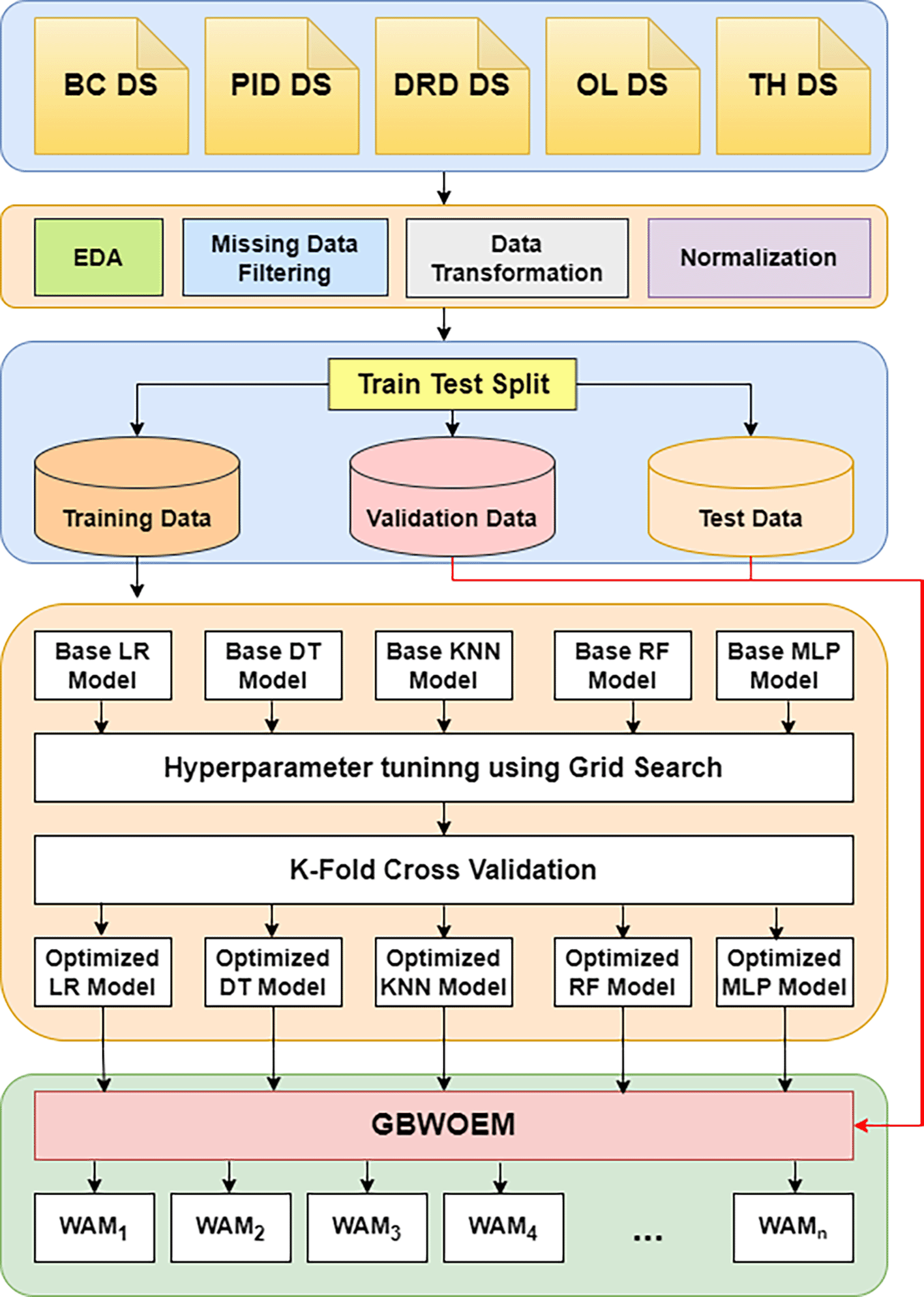 Grid Search is used to improve hyperparameters for each of these foundation models, and K-Fold Cross-Validation is used to guarantee generalization across various training data subsets. Five separately optimized models are the end product of this method. The GBWOEM iteratively selects combinations of base models ( ) or Weighted Average Models (WAM) using the five optimized models that are input. Using the validation dataset, the GBWOEM adjusts the weights of the chosen base models during each iteration to ascertain their respective contributions to the ensemble. The effectiveness of the ensemble is then determined by evaluating its performance on a test dataset. The combinatorial possibilities of choosing various subsets of the five base models yields 26 potential combinations because of the GBWOEM method. By assessing the performance of every combination on the test set, GBWOEM determines the ensemble configuration that enhances the accuracy of the predictions. With a combination of statistical, distance-based, tree-based, and neural network techniques, the final model is chosen based on best predictive performance out of all the basic models.