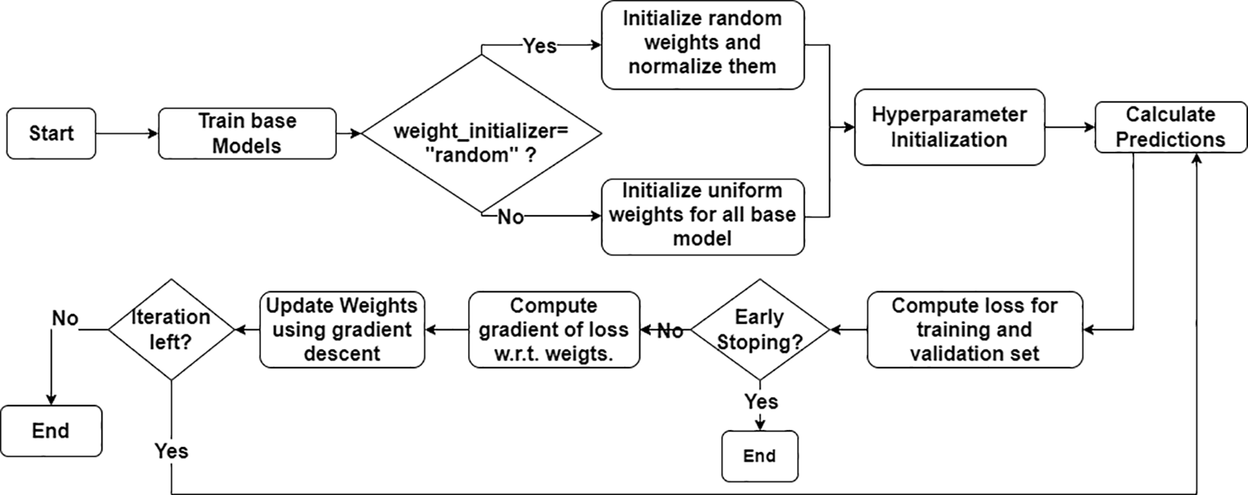 This iterative procedure continues until the loss converges, thereby guaranteeing that the ensemble model is fine-tuned to its optimal performance. The effectiveness of the algorithm also strongly depends on factors such as the learning rate, early stopping (patience), and aggregation strategy via weighted averages. The learning rate is a critical factor in solving the gradient descent optimization to achieve a trade-off between overshooting and slow convergence. Early stopping stops training when the model performance starts to improve to prevent overfitting. The “patience” parameter control number of iteration algorithm to wait before stopping, hence used to prevent over-fitting. Similarly, while aggregating, we can simply use weighted averaging by weights that best increase the overall predictive power of the model in the ensemble.