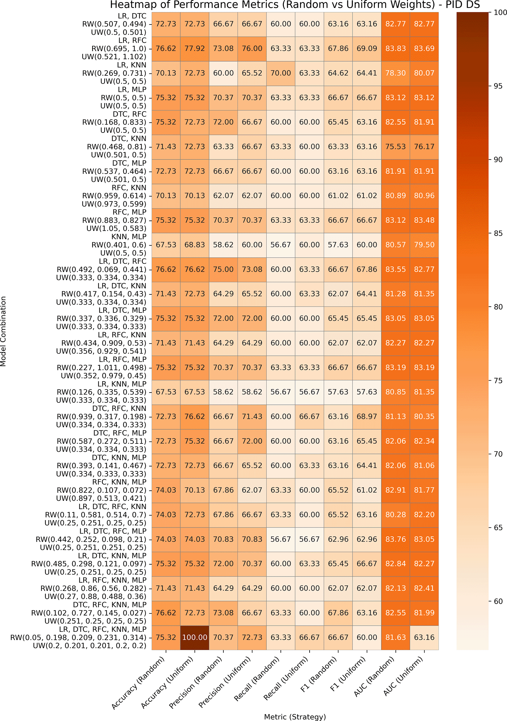 This is a common dataset utilized for research on diabetes and machine learning, which contains eight medical predictor variables, one target variable, and 768 entries. After data pre-processing, it is noticed that some columns have invalid 0’s, which are replaced with the min or median of those columns. The performances of both variants of our proposed ensemble model are presented in Figure 4. In GBWOEN-R, the (LR, RFC) (0.695, 1.0) and (DTC, RFC, KNN, MLP) (0.102, 0.727, 0.145, 0.027) pairs showed the highest accuracy, but (LR, RFC) achieved a higher AUC with RFC having the highest weights and more contribution to the final ensemble result. In GBWOEM-U, the combination of all five base models yielded the highest accuracy but a low AUC value. Again, (LR, RFC) (0.521, 1.102) achieves a balanced accuracy and AUC, with RFC dominating.