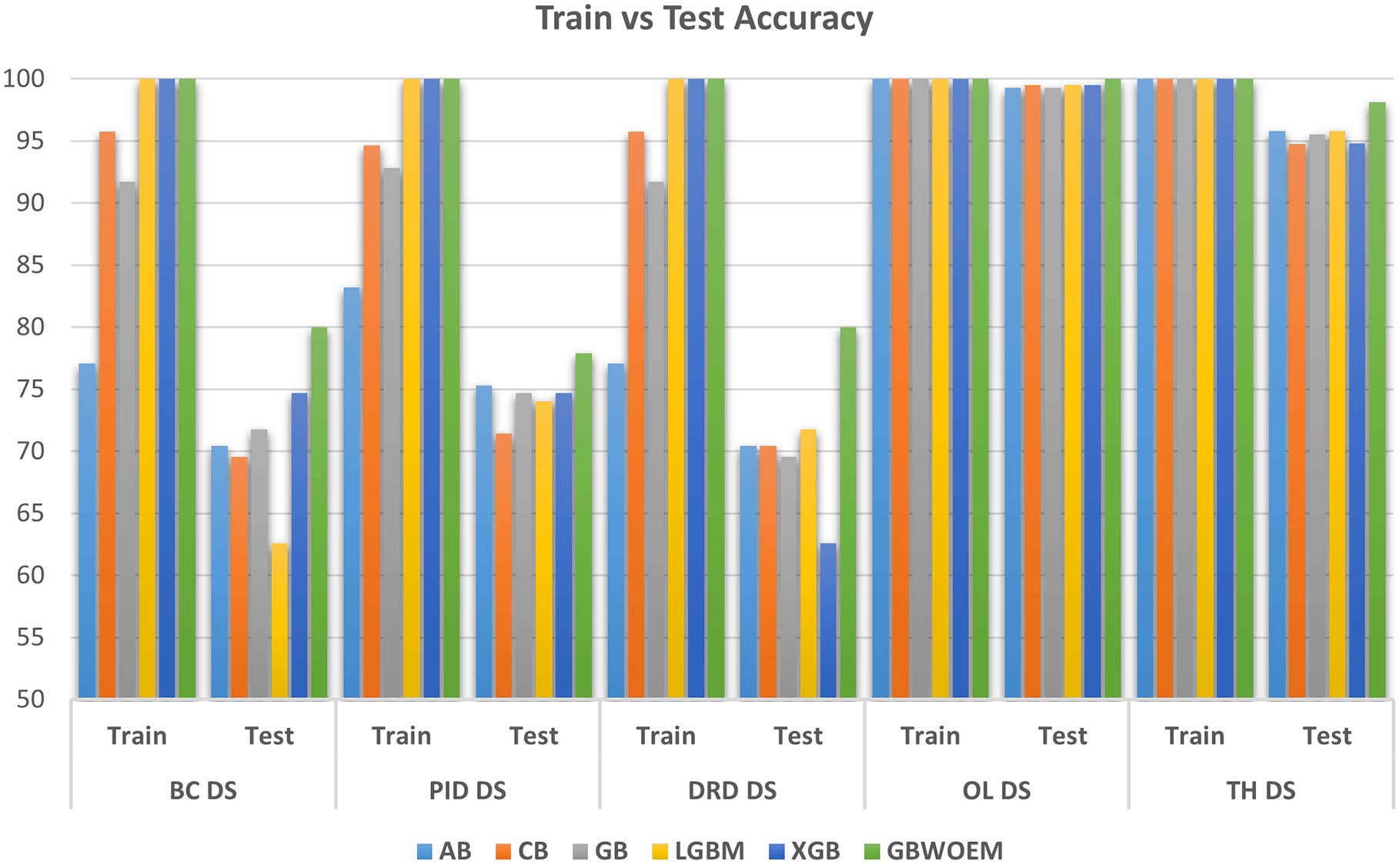 A comprehensive comparative quantitative performance for the details is given in Table 4 between the training and test accuracies of both the GBWOEM and existing models. In addition, ROC curves were drawn for each dataset for these five ensemble models and two variants of GBWOEM (GBWOEM-R and GBWOEM-U). It is very useful in the case of imbalanced datasets and helps us better understand how the model separates classes. From Figure 9, we can see that both variants of the proposed GBWOEM are able to distinguish between classes well for all datasets except PID DS. The models shows comparable results (80-90%) for performance matrices like precision, recall and F1-score, which rules out overfitting and is evident in Figures 3, 6, and 7. A bar chart ( Figure 8) is also included to show the training and test accuracies of the baseline models vs. our additionally proposed GBWOEM variants to graphically display these differences in our model accuracy.