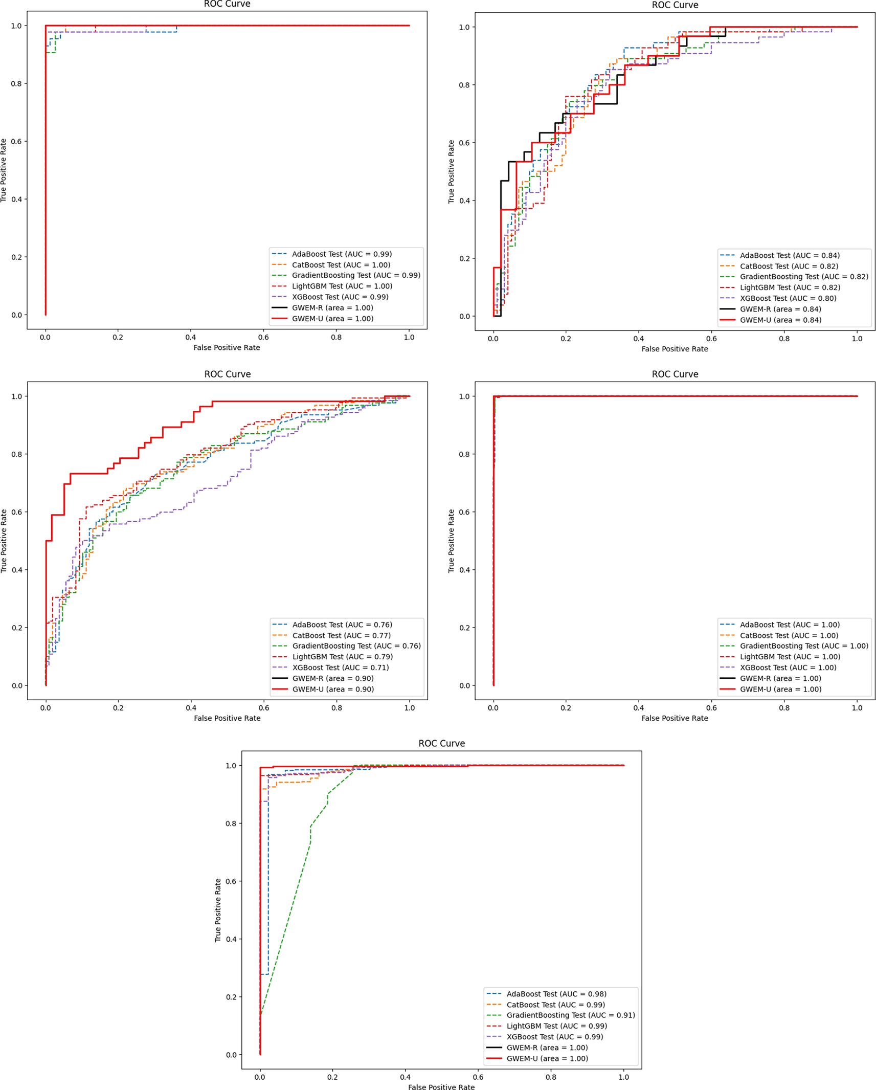 This section of the Results and Discussion section shows a comparison between GBWOEM and other existing ensemble models: Adaboost, Catboost, GradientBoost, LightGBM, and XGBoost. This will help us establish the potential benefits of our method in terms of precision, AUC, and generalization capability. Our model led to the enhancement of test accuracy compared to existing ensemble models, with improvements between 0.48% and 8.26% across all five datasets. The specific accuracy gains for each dataset were as follows: Breast Cancer (5.32%), Pima Indians Diabetes Database (2.60%), Diabetic Retinopathy Debrecen (8.26%), Obesity Level estimation based on physical condition and eating habits (0.48%), and Thyroid Disease (2.32%). Although these values differ in the amount of improvement they contribute, this highlights that one of the great features of GBWOEM is that it is capable of handling various datasets and tasks efficiently.