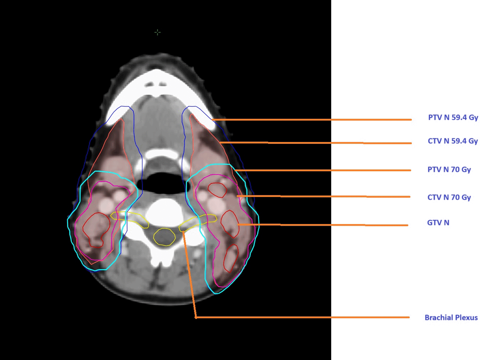 Nasopharyngeal carcinomas (NPCs), most of which are undifferentiated (UCNT), present a unique oncological and therapeutic challenge, particularly an intermediate-incidence area like Tunisia, where the incidence remains ranging from 3 to 9 new cases per 100,000 habitants annually.1,2 Radiotherapy, in combination with concomitant chemotherapy, remains the cornerstone of treatment. However, the anatomical complexity of the nasopharyngeal region poses a dual challenge: ensuring optimal tumor coverage while meticulously sparing adjacent critical structures.3 Over the past two decades, remarkable progress in imaging modalities—especially with MRI, and more recently PET-CT—has transformed the landscape of radiotherapy planning. These technologies, coupled with advanced tools for image fusion and multiplanar reconstruction, have greatly refined the precision of target volume delineation.4,5 In parallel, the emergence of advanced irradiation techniques such as intensity-modulated conformal radiotherapy (IMRT), has allowed clinicians to deliver highly conformal dose distributions that optimize tumor coverage while respecting dose constraints for organs at risk (OARs).6,7 These dose constraints have been established over time by expert radiation oncology societies, based mainly on retrospective dose–effect correlation studies and meta-analyses.8,9 For the brachial plexus, dose constraints remain controversial. Indeed, the complex anatomy of the brachial plexus and its variable relationship with adjacent structures lead to significant inter- and intra-observer variability in contouring, which remains challenging. Moreover, variability in fractionation schedules, dose per fraction, overall treatment time, and total dose across institutions adds further complexity to retrospective analyses, partly explaining the variation in the recommended maximum dose to the brachial plexus, which typically ranges between 60 and 66 Gy according to international guidelines.10–12 Understanding and addressing these variations is crucial, not only to improve therapeutic outcomes but also to minimize the risk of debilitating complications such as radiation-induced brachial plexopathy.