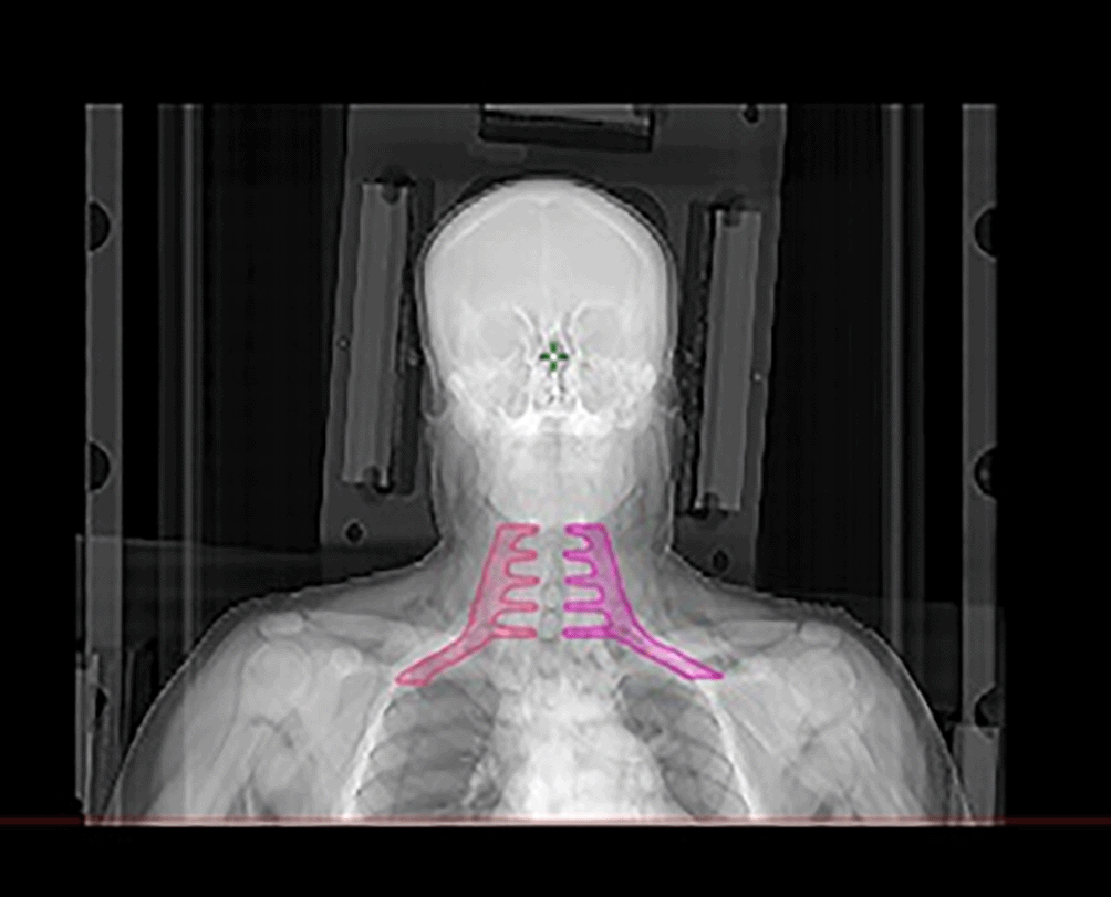 Imaging for treatment planning was conducted using a Philips® BigBore simulator scanner with 3 mm slice thickness. Patients were positioned supine, immobilized with a 5-point thermoplastic mask, and underwent a dosimetric scan with intravenous contrast when there were no contraindications. Target volumes were defined according to ICRU guidelines,14,15 with three key volumes: Gross Tumor Volume (GTV), Clinical Target Volume (CTV), and Planning Target Volume (PTV) (Figure 1). The GTV includes visible tumor, the CTV encompasses areas with potential microscopic disease, and the PTV adds a margin to account for uncertainties such as patient motion and setup errors. High-risk CTVs receive the highest dose, extending from the GTV to include the nasopharyngeal region, with margins depending on anatomical boundaries and nodal involvement.16,17 Intermediate- and low-risk CTVs are defined based on the tumor’s extension and regional lymph node involvement. The PTV was defined by extending the CTV by 5 mm in all directions to account for treatment uncertainties. This margin was applied to both the nasopharyngeal and lymph node regions (Figure 1). In our study, the brachial plexus was delineated following the Radiation Therapy Oncology Group (RTOG 618) guidelines, with contouring adjustments at the lower part based on the recommendations of Sun Ki Yi et al. This adjustment was necessary due to the requirement to irradiate the level 4 lymph node area within the prophylactic volume18,19 (Figure 2). The treatment was administered using a linear accelerator with the IMRT technique (VARIAN CLINAC® IX, MLC 120) and 6 MV X-rays (Figure 3). All patients received 2 Gy per session, five days a week, targeting the tumor volume and affected lymph nodes, totaling 70 Gy. For intermediate-risk cervical lymph node areas (retropharyngeal, II, III, V, and occasionally IV, Ia, Ib according to N involvement), the prescribed dose was 59.4 Gy with 1.7 Gy per fraction across 35 sessions in simultaneous integrated boost.