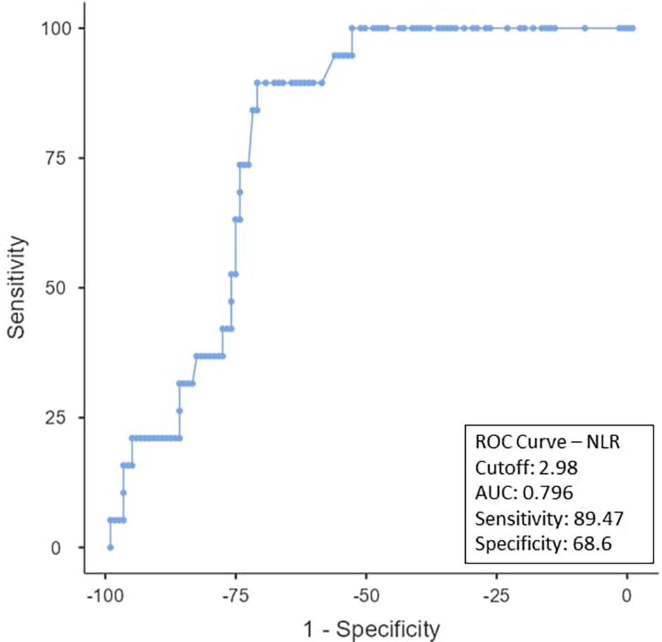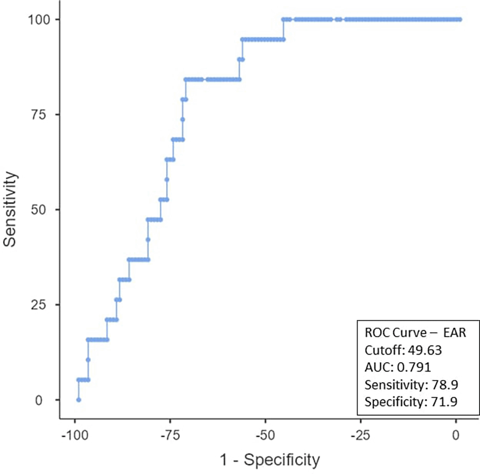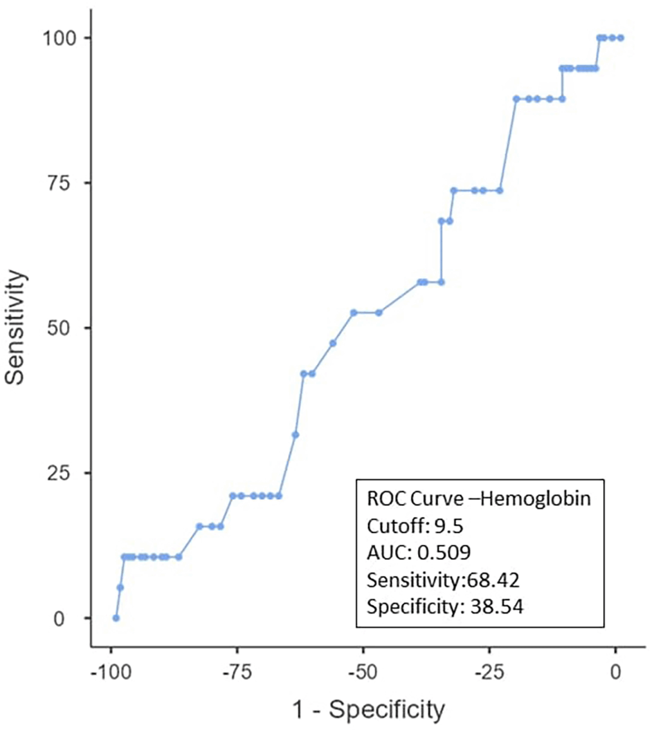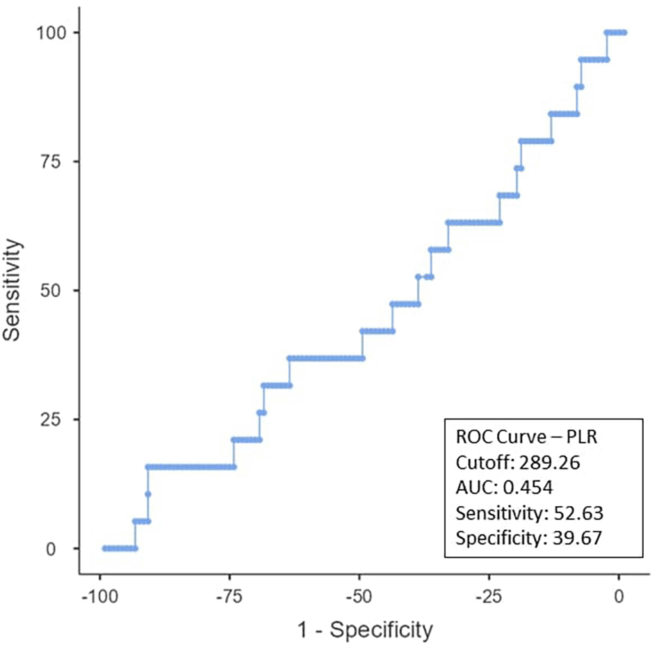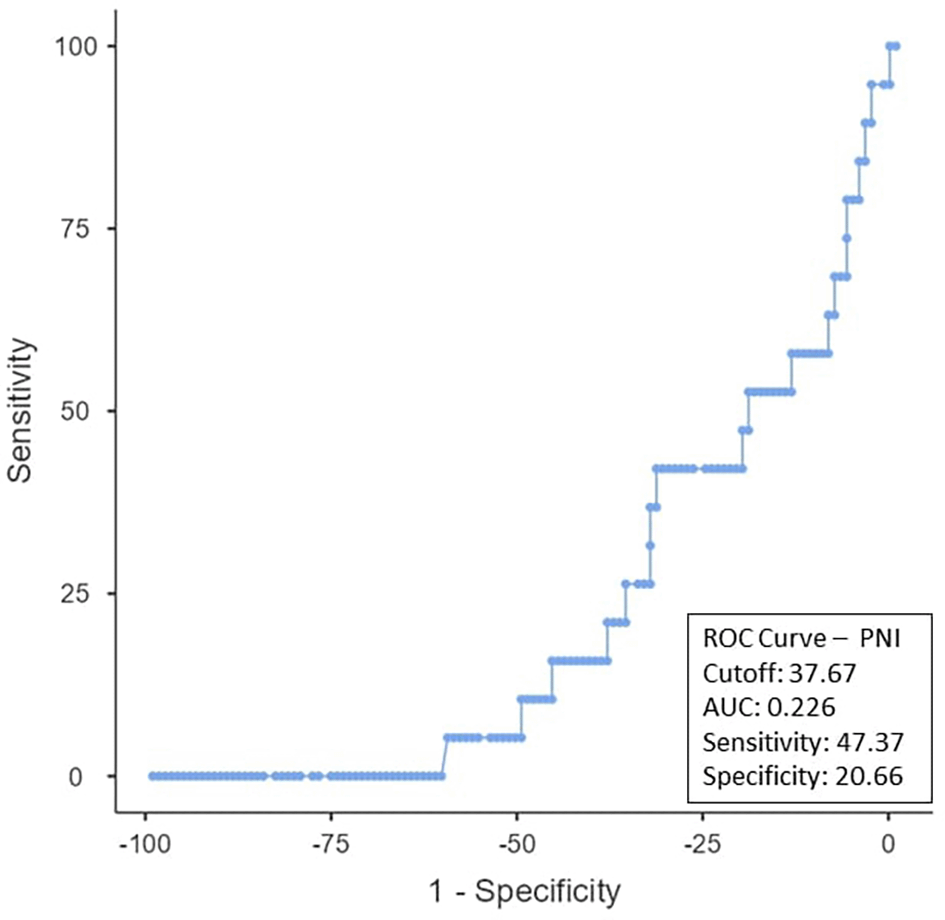 To determine the ideal cut-off value for pretreatment hemoglobin, NLR, PLR, PNI, and EAR, a ROC curve analysis was performed ( Table 3). It was shown that the hemoglobin cut-off value was < 9.5 (AUC: 0.509; 95% CI), with 38.3% specificity and 68.42% sensitivity (Figure 1). As can be observed in Figure 2, the NLR cut-off was found to be < 2.98 (AUC:0.796; 95% CI), with 89.47% sensitivity and 68.6% specificity. The PLR cut-off was 52.63% sensitive and 39.67% specific, with an AUC-0.454; 95% CI of ≤ 289.26 as shown in Figure 3. The PNI cut-off was < 37.67 (AUC-0.226; 95% CI), with a sensitivity of 47.37% and a specificity of 20.66% ( Figure 4). The EAR cut-off was < 49.63 (AUC-0.791; 95% CI) with a sensitivity of 78.9% and a specificity of 71.9% ( Figure 5). The non-responder group exhibited a notably higher proportion of patients compared to the responders group when using the calculated cut-off values from the ROC analysis (Table 4).