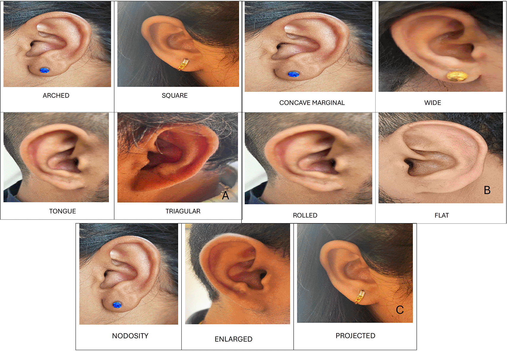 This study included 40 participants (20 males and 20 females). Participants were between the age of 18-25yrs. Measurements were taken with the subject’s head in the Frankfort horizontal plane. 18 measurements were taken like ear length and width, lobule height and width, concha length and width, tragus length, morphological ear length, helical mastoid distal length, thickness of ear lobe, auricular inclination angle, antihelical take off angle, concha mastoid angle, auricular index, lobular index, concha index, ear attachment length index and conchal bowl depth on external ear were taken and the morphological features like shape of ear, ear lobe, darwin’s tubercle and ear tragus, attachment of ear lobe and form of helix of both the right and left ears were noted. A digital Vernier caliper was used to measure all parameters. The angles were measured using a goniometer. Normal distribution was verified using the Shapiro–Wilk test. For normally distributed parameters, an independent t-test was used, and for non-normally distributed parameters, the Mann-Whitney U test was used to compare sexes. To compare the right and left parameters, independent t-tests (for normally distributed data) and Mann-Whitney U tests (for non-normally distributed data) were applied. Sex determination and stature estimation were performed using logistic regression analysis.