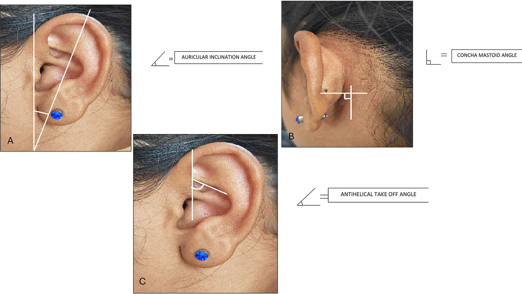 11. Antihelical take off angle: The angle measured as the antihelix projects from the concha bowl.
