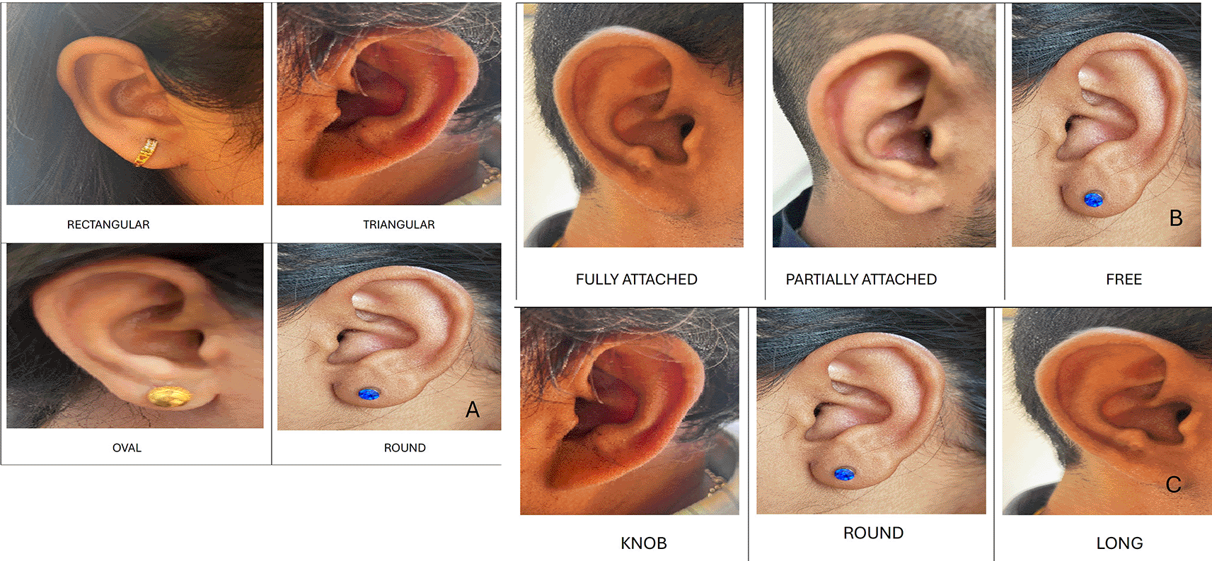 Verma et al. found that free and attached ear lobes were noted in 35% and 65% of the cases, respectively. The oval ear shape was the most common, followed by triangular, rectangular, and round shapes. No statistical differences were noted in the ear and lobular indices between males and females.26 In our study, 45% of free and 55% of attached ear lobes were observed. The oval ear shape was the most evident, followed by triangular, round, and rectangular. In our study, statistical differences were observed in the ear and lobular indices between males and females. These differences in findings can be ethnic, as they have conducted research in the northwestern and northeastern regions of India, and we have conducted the study in South India.