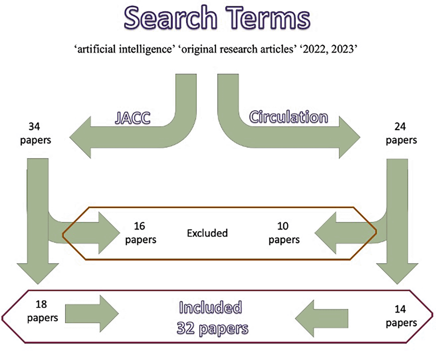 We used the search terms ‘artificial intelligence’, ‘machine learning’, ‘original research articles’ ‘2022, 2023’ in both JACC and Circulation on the 12th May 2023. This generated 58 papers. 24 papers were excluded based on the abstract. On reviewing the full-text papers, a further two papers were excluded due to not using a prognostic model. The included list of papers can be seen in Appendix 1. See Figure 2 for further information regarding paper selection.
