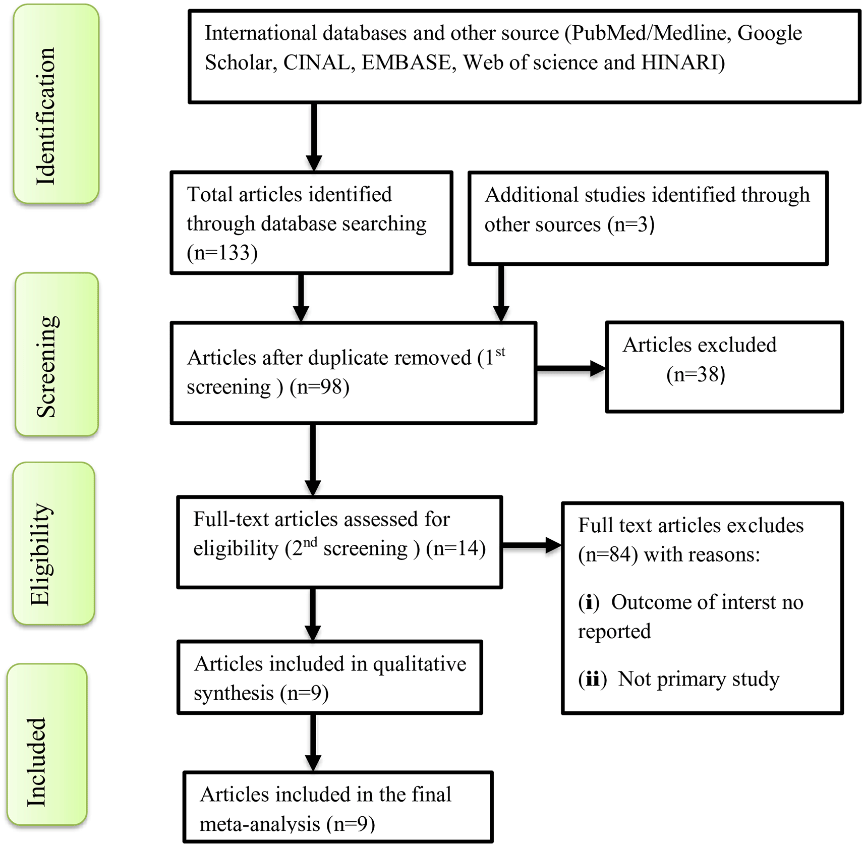 We had the opportunity to find a total of 136 articles using an electronic search of PubMed/Medline, Google Scholar, Google, CINAL, EMBASE, Web of science, HINARI and reference lists of earlier prevalence studies. Among the reviewed articles, 98 articles were screened after duplicates were removed, and after reading the abstracts and titles, 84 of them were excluded. The eligibility of the remaining 14 full-text articles was evaluated. Lastly, 9 articles met the eligibility criteria and were included in the final analysis, as shown in the chart of study selection process ( Figure 1).