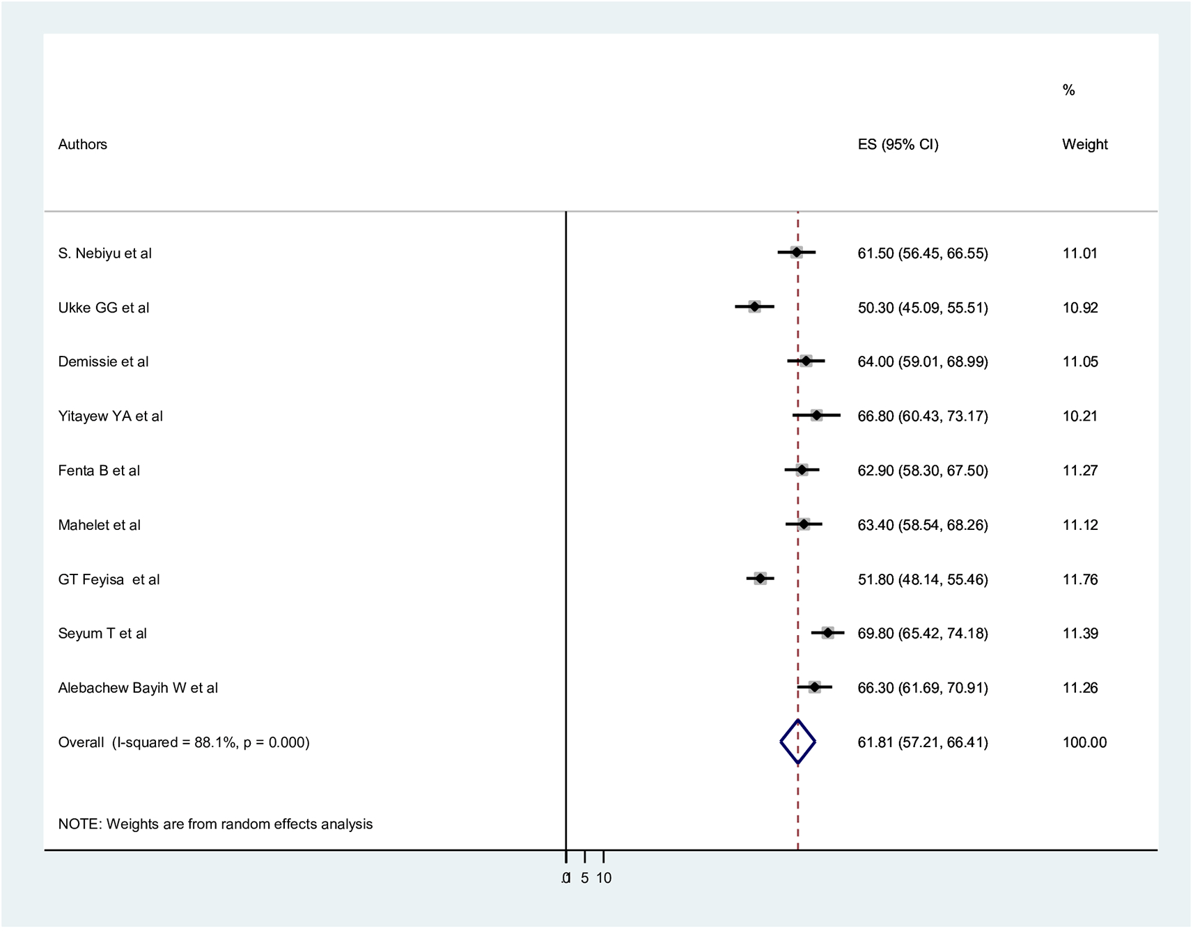 | Alebachew Bayih et al.51 | 61.24 (56.21, 66.27) | 88.7% | 0.000 |