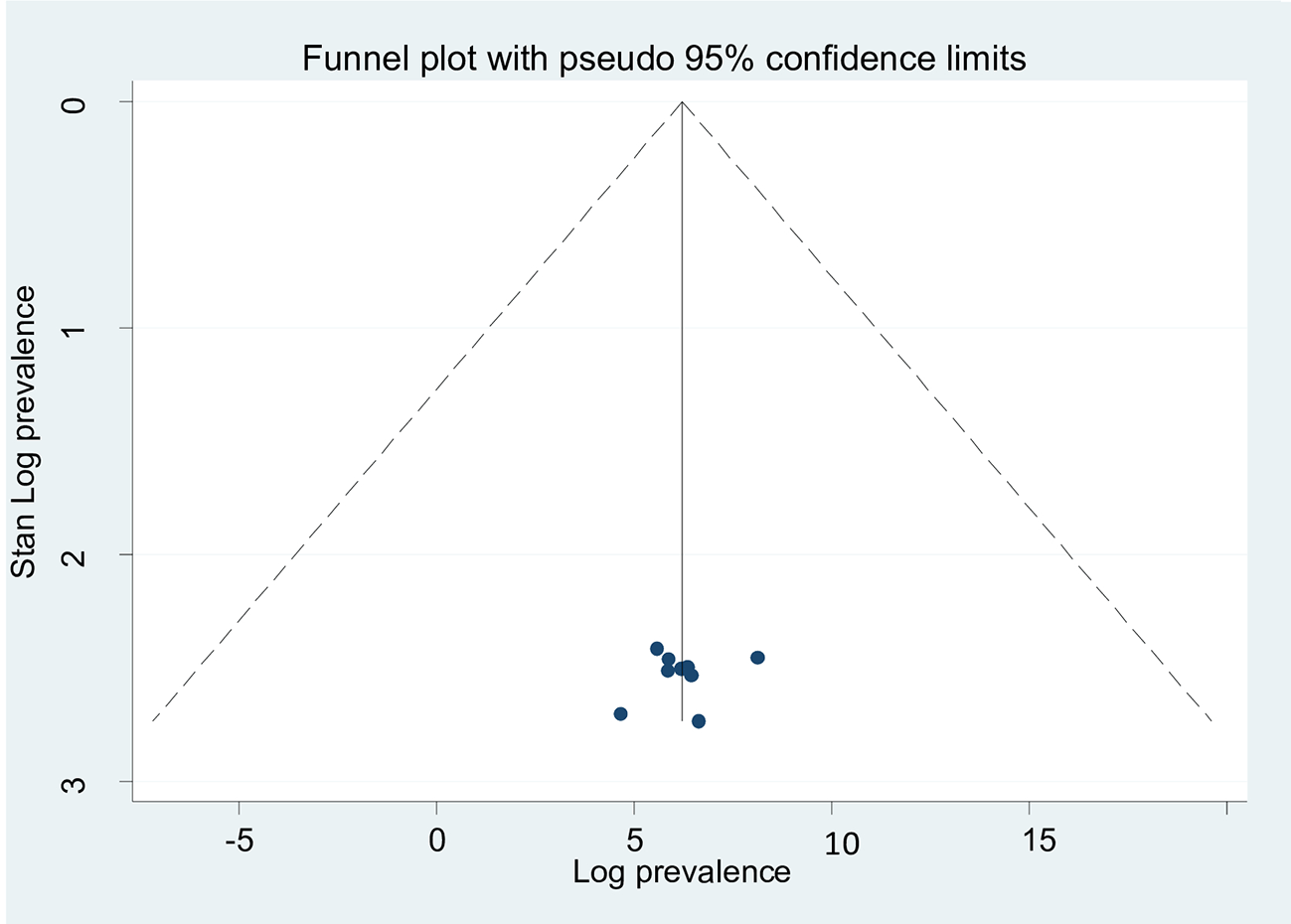 There was significant heterogeneity between the included articles, as shown on the test statistic (I2 = 88.1%, p = 0.000) ( Figure 2). A funnel plot and the Egger’s regression test were used to assess the publication bias. A funnel plot indicates that the absence of publication bias in the included articles ( Figure 3). To confirm the absence of publication bias, Egger’s test was employed and the test revealed a P value of 0.337, which indicates there is no evidence for publication bias ( Table 2).