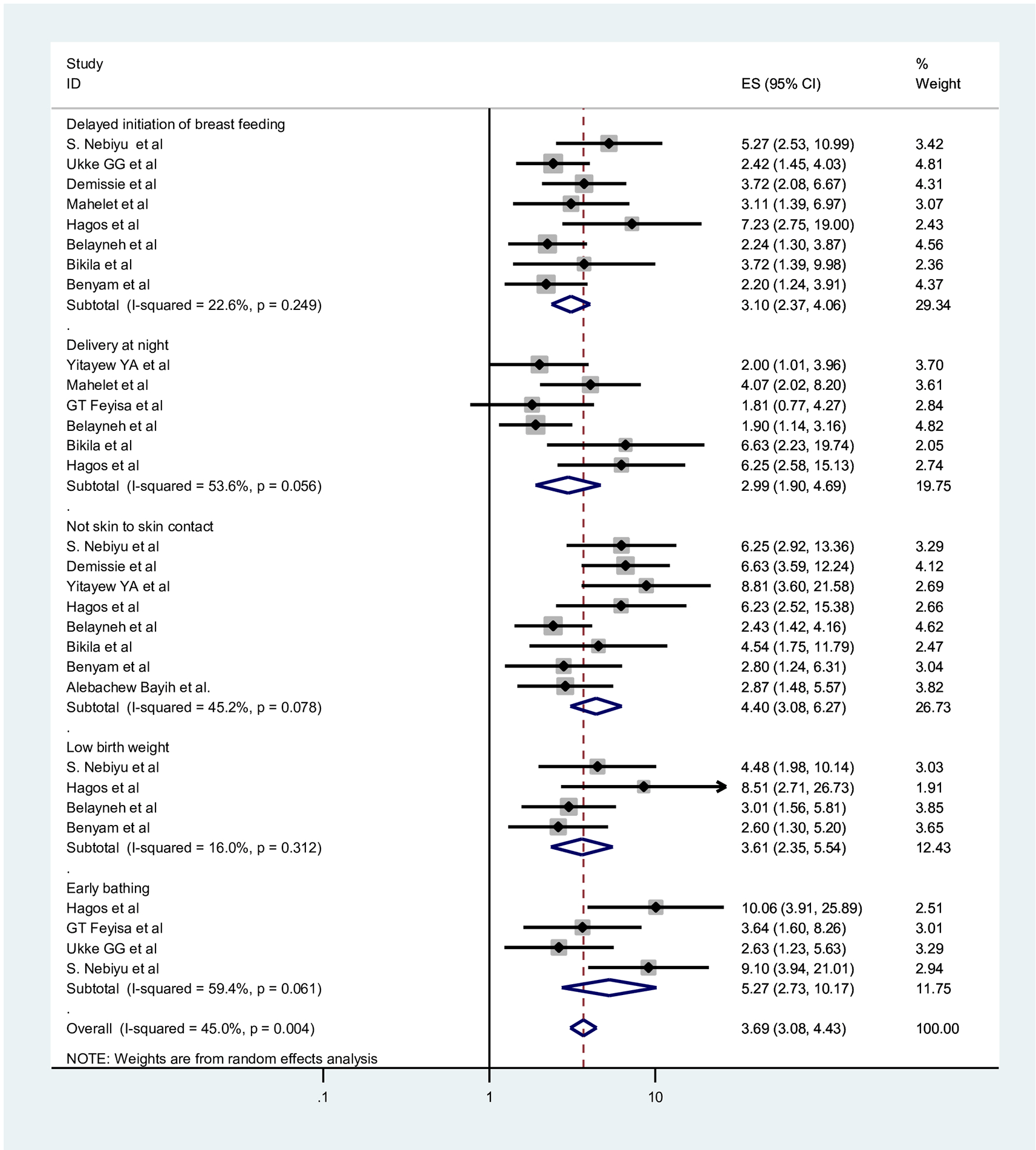 This study confirmed that five factors were significantly associated with neonatal hypothermia in Ethiopia. Based on the findings of this systematic review and meta-analysis, the likelihood of neonatal hypothermia occurrence was 3.1 times higher among neonates who had delayed initiation of breast feeding than neonates with initiation of breast feeding with in one hour of birth [adjusted odd ratio (AOR) = 3.10; 95% CI 2.37, 4.05]. Neonates who had no skin to skin contact with their mother immediately after delivery were 4.4 times more likely to develop hypothermia when compared with those who have skin to skin contact immediately after delivery (AOR = 4.40, 95% CI: 3.08, 6.27) in eight studies that were included in this meta-analysis.