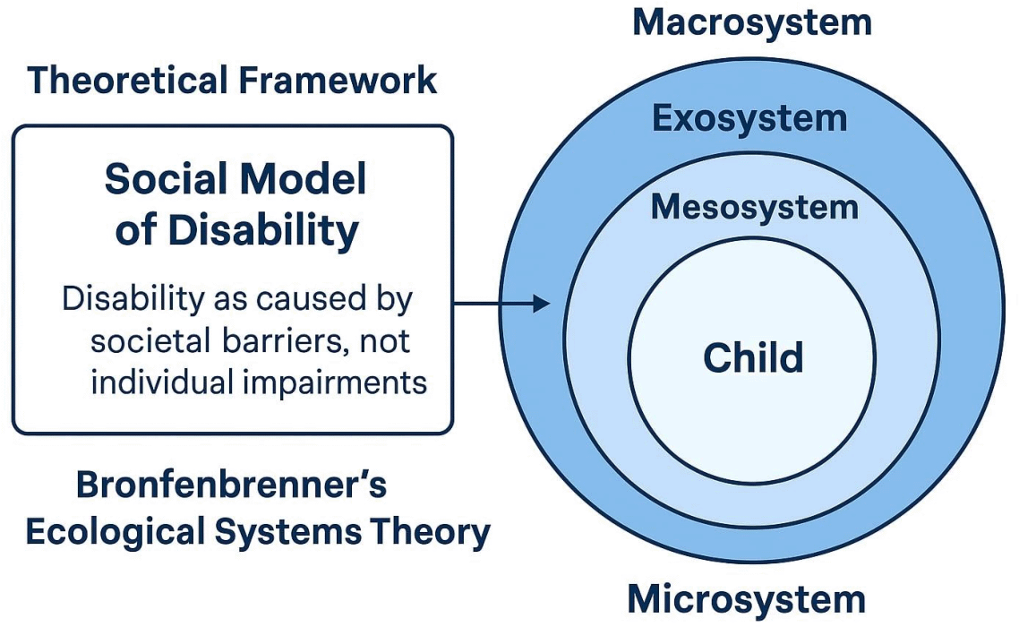This study is underpinned by two interrelated theoretical frameworks: the Social Model of Disability and Bronfenbrenner’s Ecological Systems Theory. Together, these perspectives provide a comprehensive understanding of the systemic, environmental, and social factors influencing inclusive education for children with special needs in Jeddah, Saudi Arabia, as shown in Figure 1.