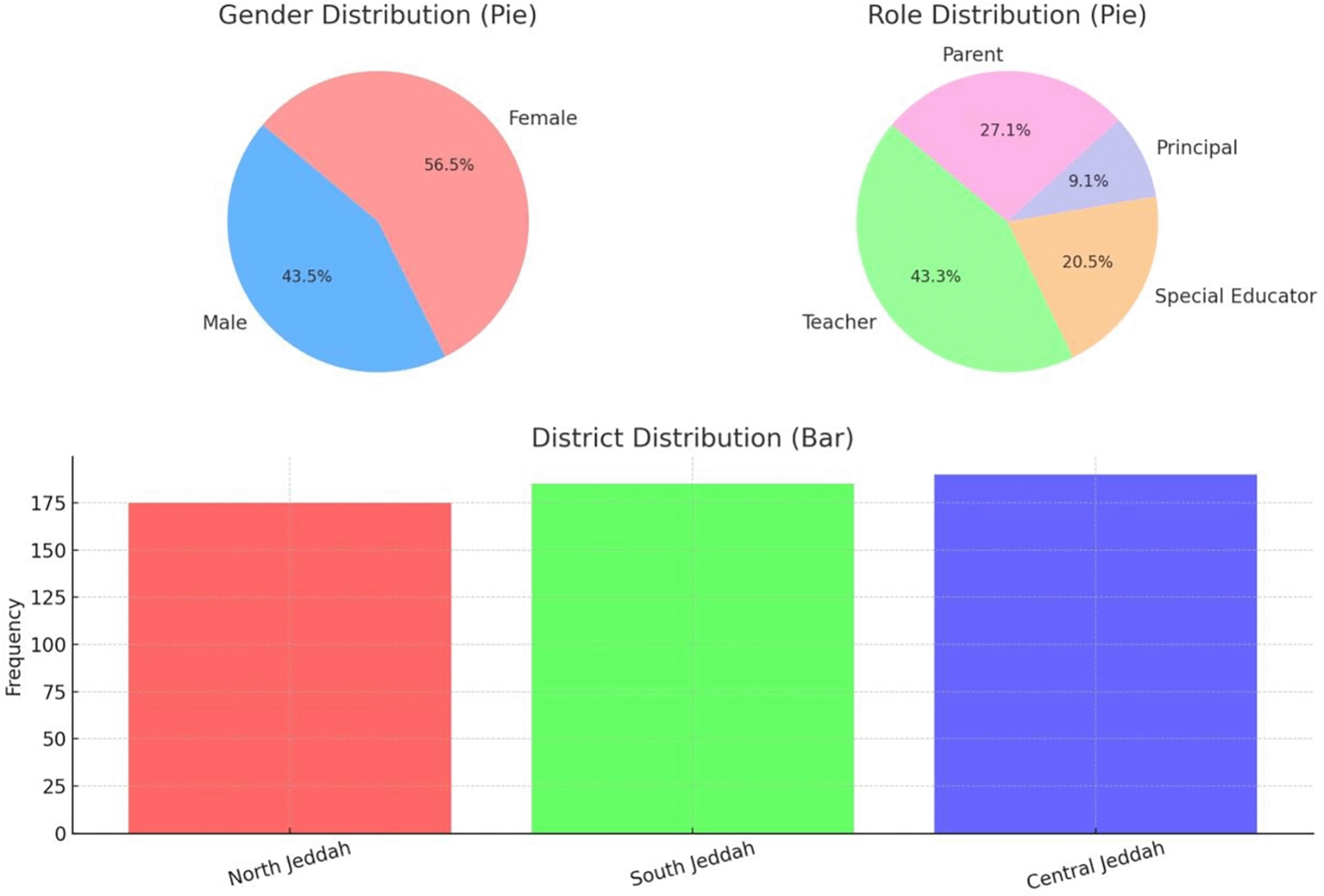 The demographic data in Table 1 show a balanced gender distribution, with 56.55% female and 43.45% male participants, indicating diverse gender perspectives in the study. The largest respondent group was teachers (43.27%), followed by parents (27.09%), reflecting strong representation from those directly involved in inclusive education. Additionally, participants were fairly evenly distributed across North, South, and Central Jeddah, enhancing the geographic representativeness of the findings, as shown in Figure 2 below.