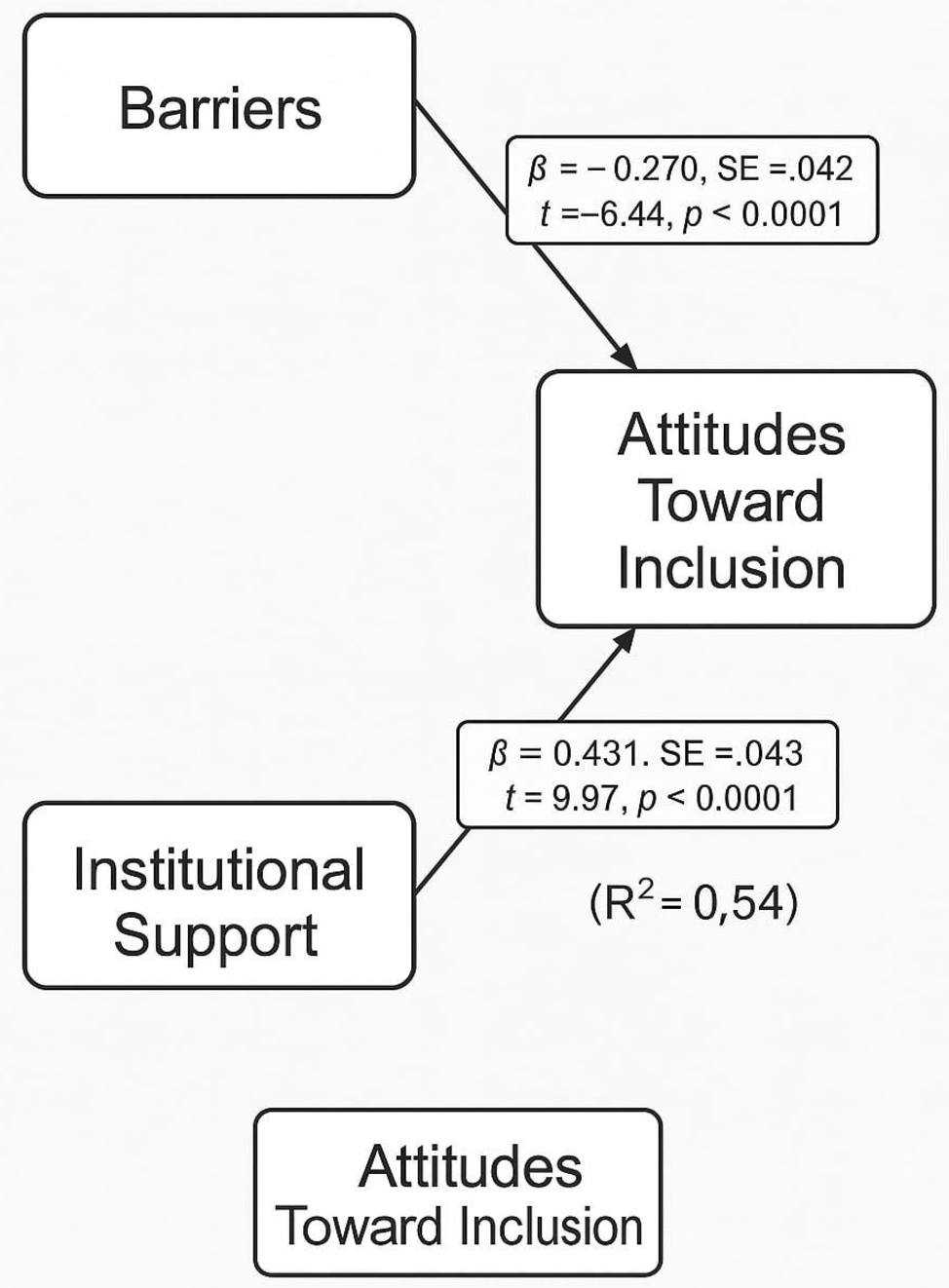 To further clarify the directional influences and account for standardized relationships, a Path Analysis was performed using standardized variables. This model showed stronger and statistically significant relationships. Perceived barriers negatively predicted attitudes (β = -0.270, p < 0.0001), while institutional support positively predicted attitudes (β = 0.431, p < 0.0001). These results provided robust evidence that, when properly scaled and modeled, the institutional and structural context plays a crucial role in shaping stakeholders’ perceptions of inclusive education.