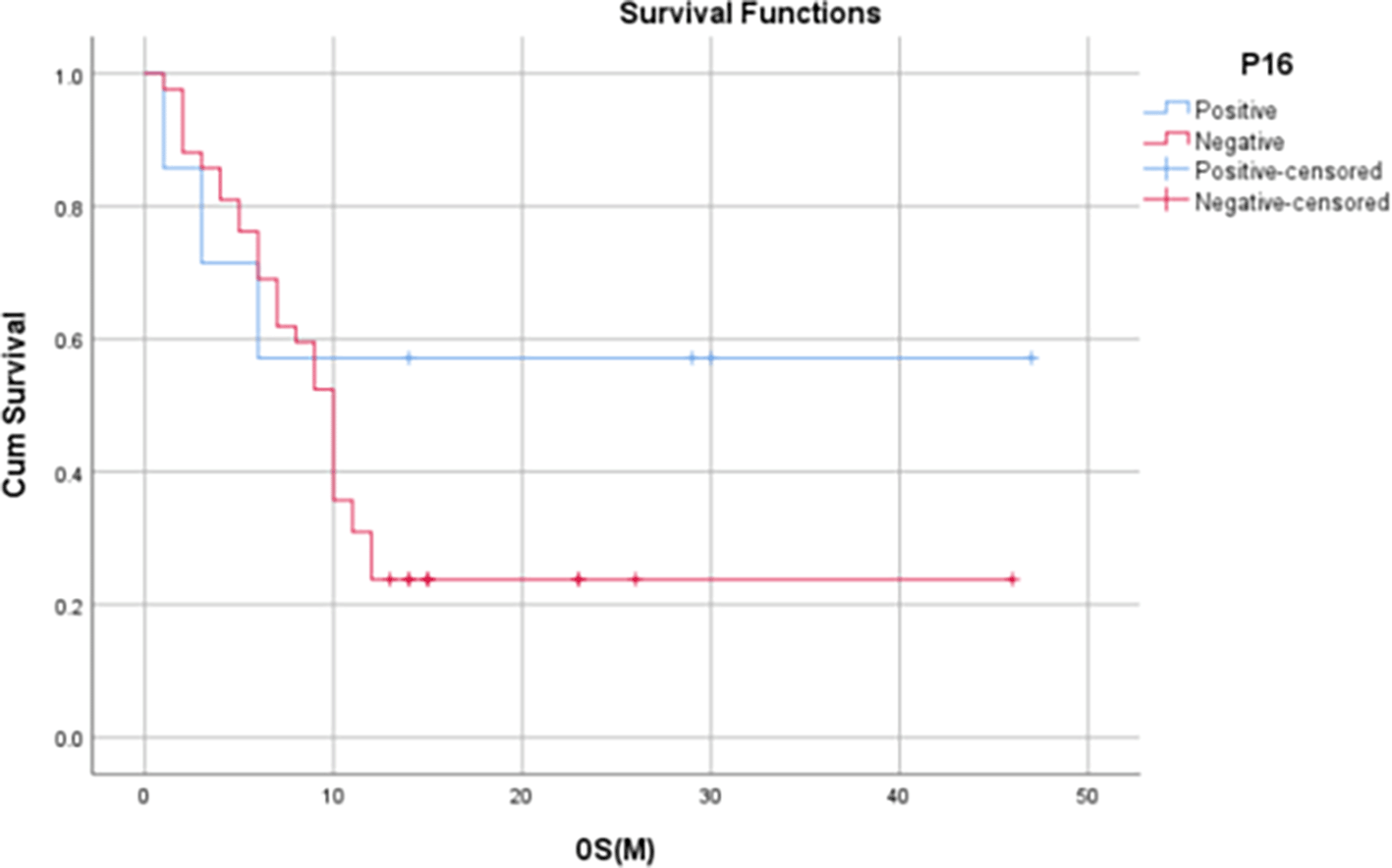 Median OS for p16 positives patients was 14 months (IQR: 3-30 months) and the median OS among p16 negative subjects was 10 months (IQR: 5.75 – 12.25 months). 1-year OS rate was found to be significantly higher in p16-positive patients when compared to the of p16-negative patients (80% vs. 44.1%, p=0.045).