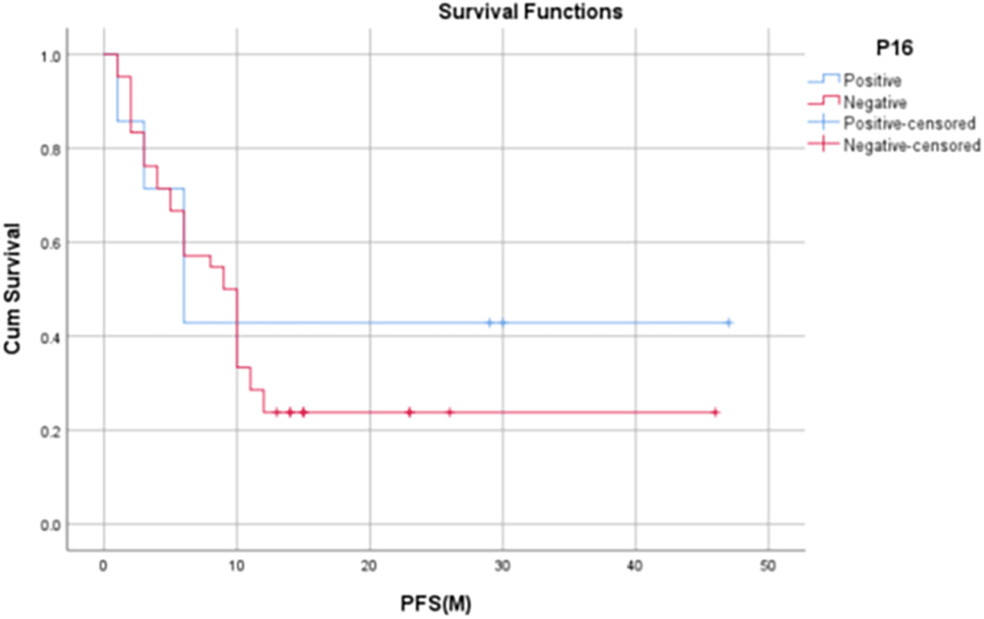 Median PFS for p16 positive patients was 6 months (IQR: 3-30 months) and the median PFS among p16 negative patients was 9.5 months (IQR: 3.75 – 12.25 months). 1-year PFS rate in p16-positive patients in our study was found to be 60% whereas, in p16-negative patients, it was found to be 31.8%.