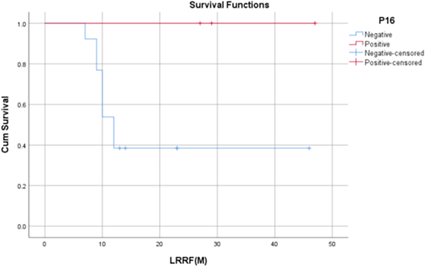 The median LRRFS for p16 positive patients was 29 months (IQR: 17-29 months), and the median LRRFS among p16 negative patients was 12 months (IQR: 9.5– 18.5 months). 1-year LRRFS rate of p16-positive patients was found to be 75%, whereas it was 42% in p16-negative patients ( Table 6, Figures 5-7).