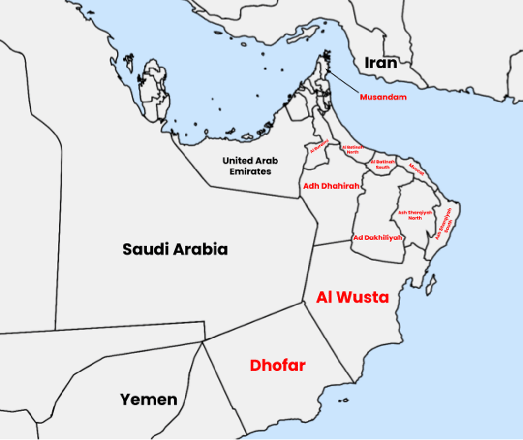 Map (drawn using https://www.mapchart.net/ and licensed under a Creative Commons Attribution-ShareAlike 4.0 International License.) showing Dhofar region (Dhofar Governorate) in the south of Oman. It is the largest of 11 governorates in Oman in terms of area with a population of around 500,000 people.
