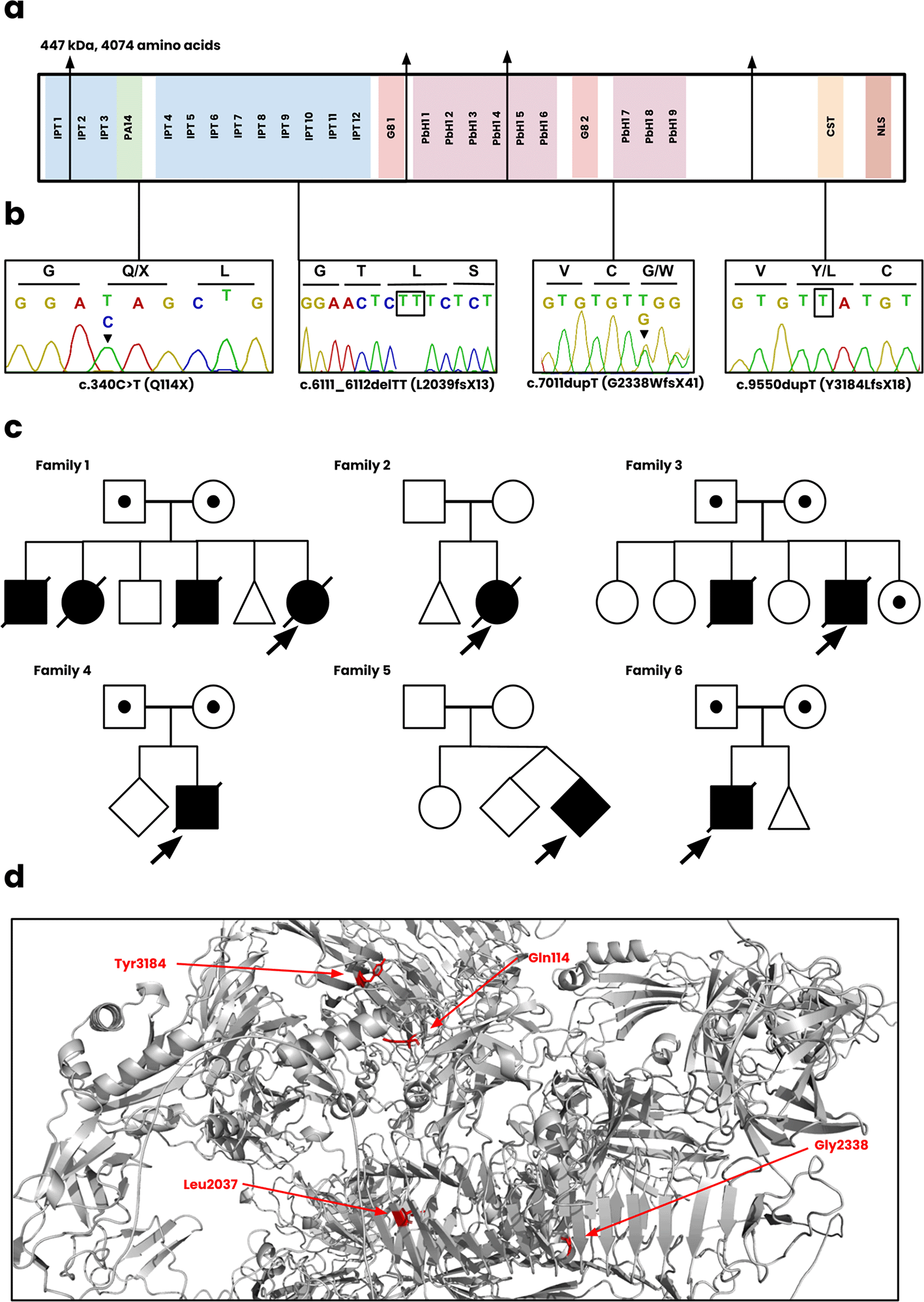 (a) The functional regions of fibrocystin, including the IPT, PA14, G8, PbH1, CST, and NLS domains. (b) Sanger sequencing of the c.340C>T, c.6111_6112delTT, c.7011dupT, c.9550dupT variants. The sequence for c.7011dupT of the patient is unavailable and instead displayed for the heterozygote parent. (c) The pedigree diagrams for all six Omani families. Squares, males; Circles, females; Shaded, affected. (d) Position of novel mutations on the wild-type structure of fibrocystin.