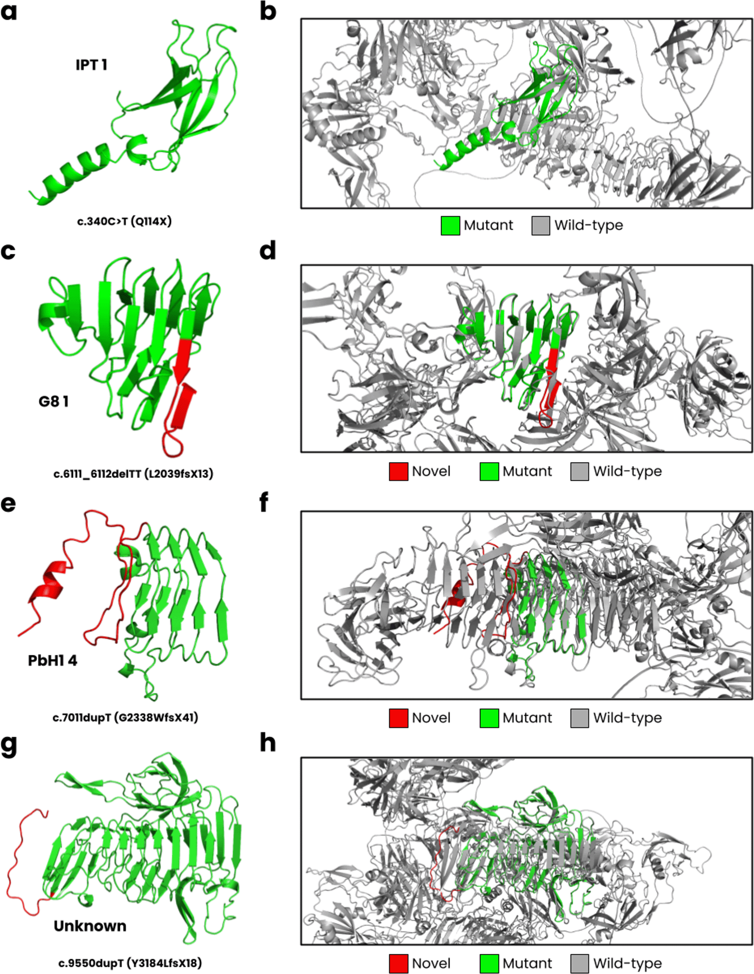 (a) The c.340C>T mutation is predicted to cause a Q114X nonsense variant, (b) where the mutant structure only partially encodes for the IPT one domain compared to the wild-type structure. (c) The c.6111_6112delTT leads to L2039fsX13, impacting the G8 1 domain, and (d) encoding nearly half of the wild-type structure. (e) The c.7011dupT cause a G2338WfsX41 frameshift, (f ) where PbH1 is partially lost. (g) Lastly, the c.9550dupT leads to Y3184LfsX18, encoding an unknown domain of PKHD1 (h) close to the C-terminal region.