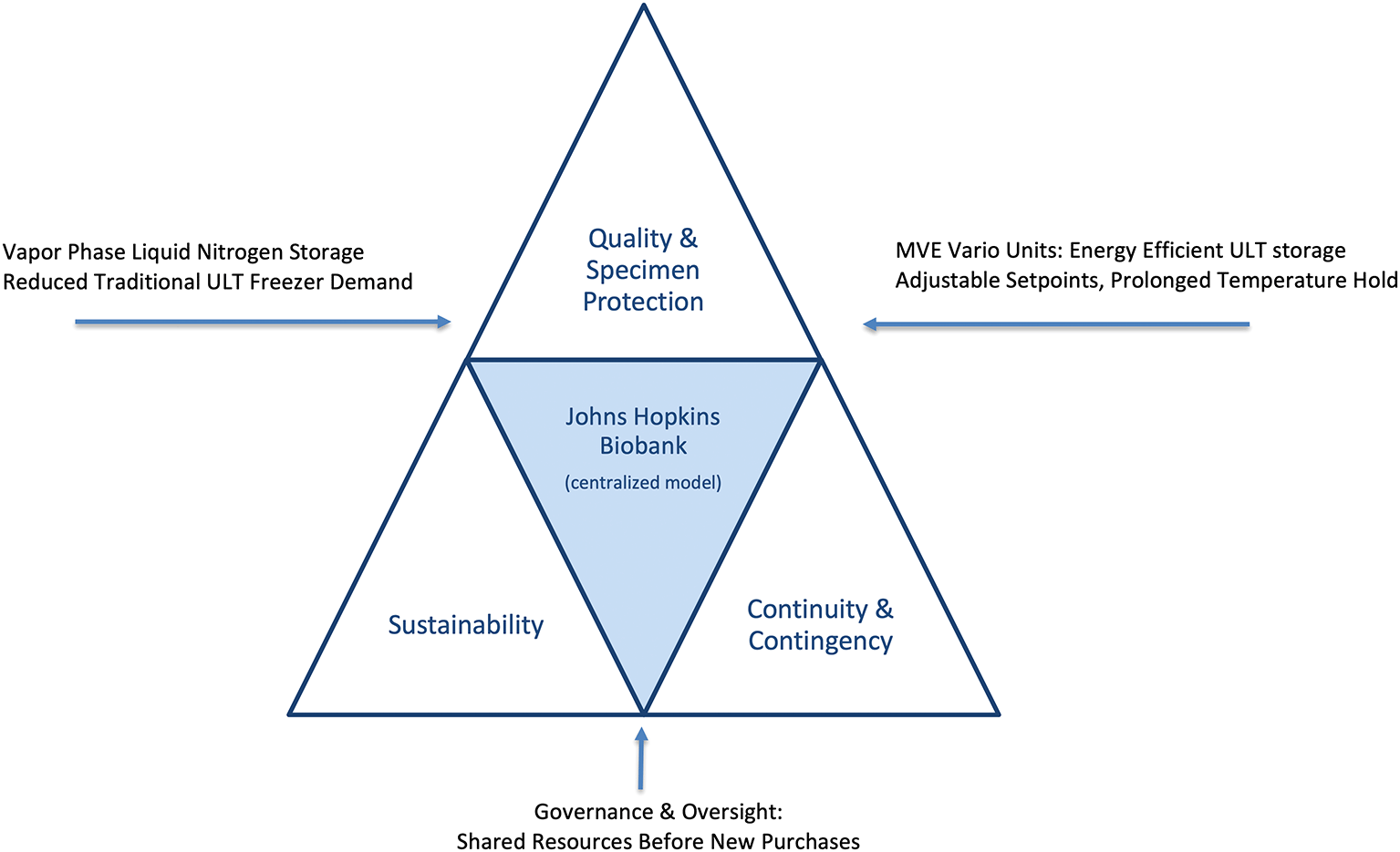 The Johns Hopkins model aligns with ISBER Best Practices and CAP Biorepository Accreditation Standards, which emphasize monitoring, redundancy, and quality management. Consolidating freezer assets, prioritizing LN2 vapor-phase storage, adopting efficient ULT technologies such as the MVE Variō, and embedding oversight into equipment purchasing translated these standards into institutional practice.