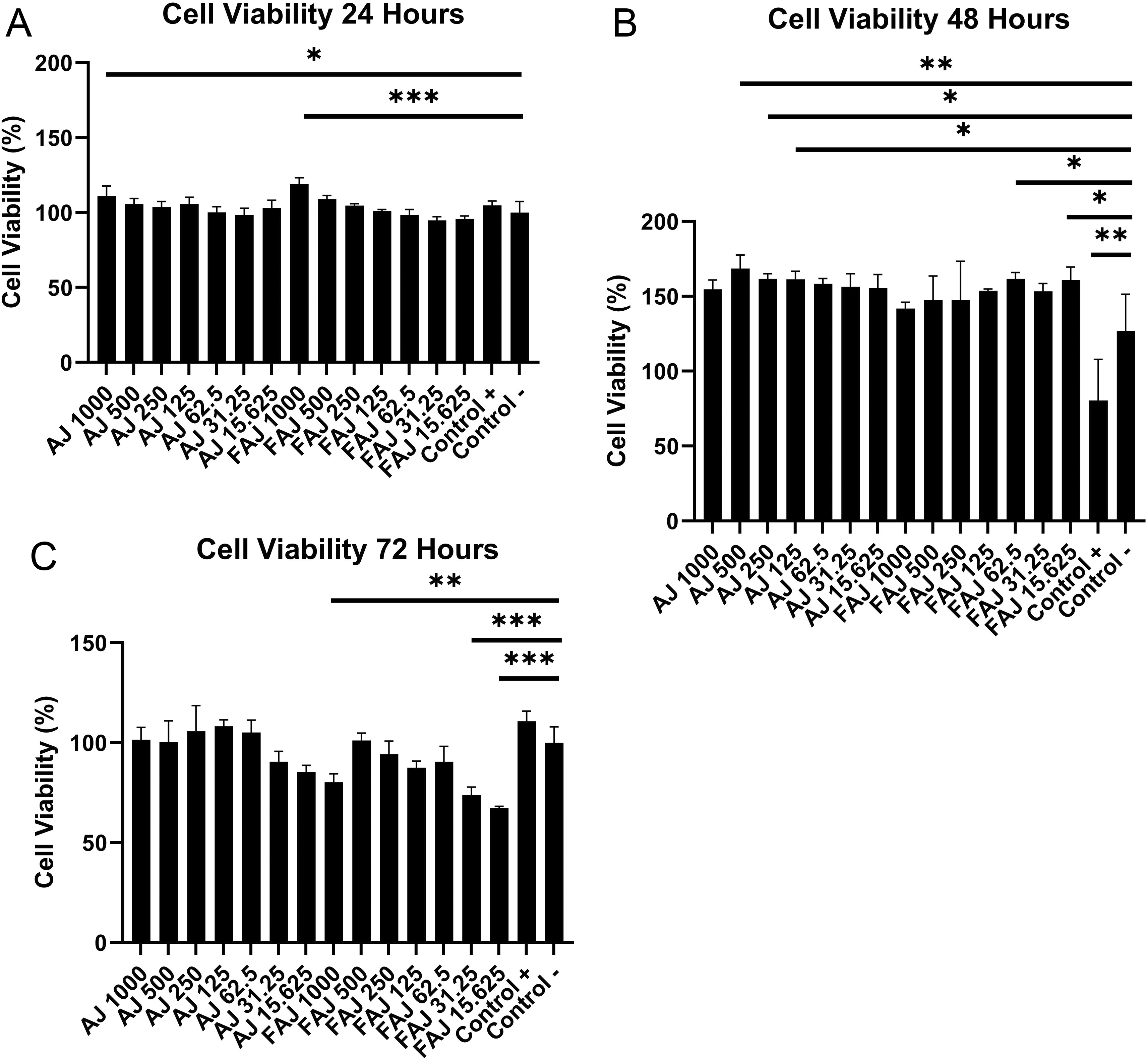 Cell line received various concentrations of AJ and FAJ extracts for (A) 24 hours; (B) 48 hours; (C) 72 hours. The error bars depict mean values ± SD from triplicate experiments. The significance was set to *p<0.05, **p<0.01, and ***p<0.001, compared with non-treated fibroblasts cell line.