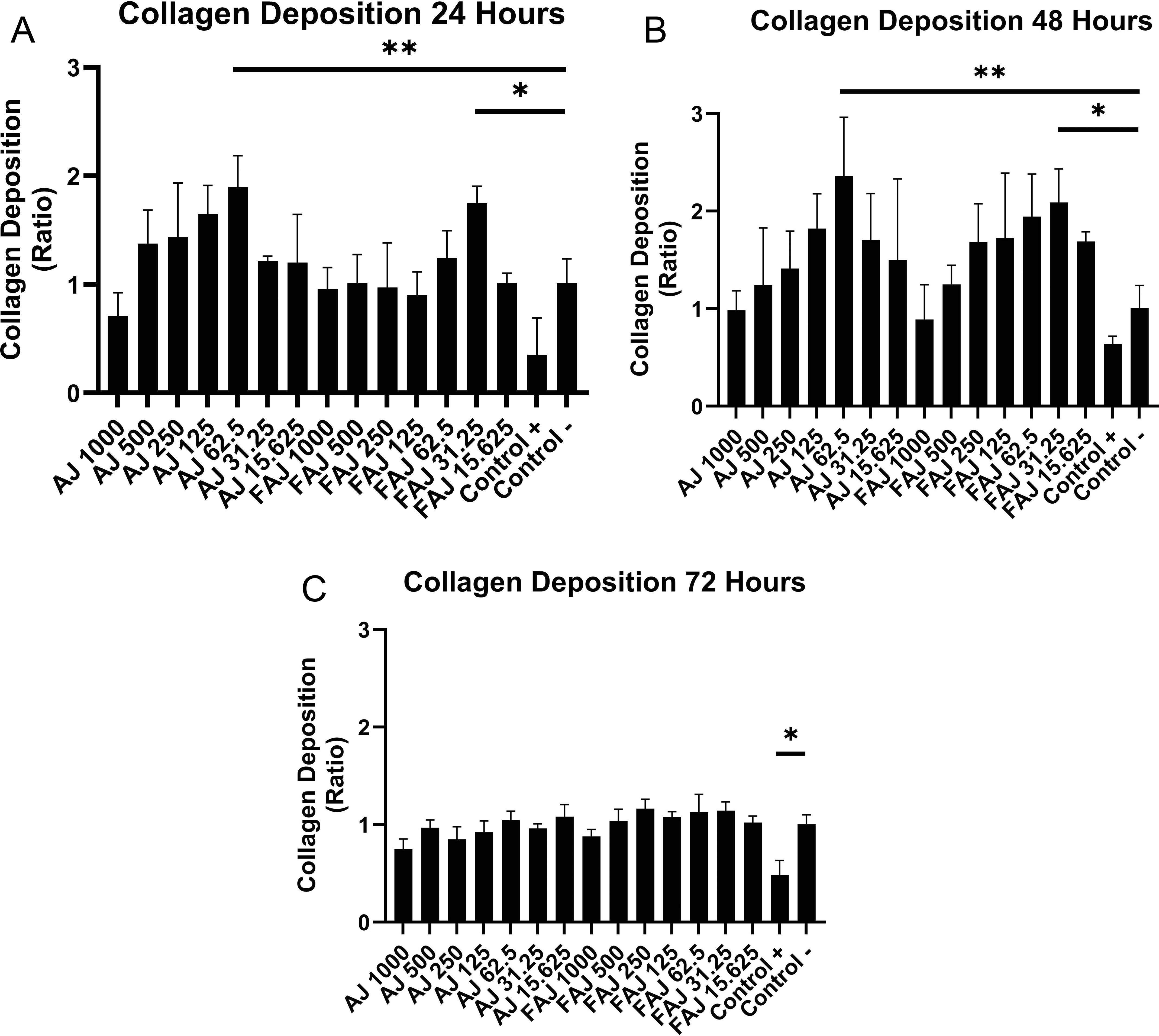 The effect of FAJ on fibroblast collagen deposition was compared with that of the fibroblast cell line that received AJ after cells were exposed to the extract for 24, 48, and 72 hours. Overall, the collagen deposition ratio (Figure 2) showed the same pattern as cell viability, which increased up to 48 hours and decreased after 72 hours of extract exposure, except in the fibroblasts group that received AJ 250-1000 μg/mL. The analysis carried out on the data showed that the duration of extract exposure (24, 48, and 72 hours) and variation of extract from 15.625 to 1000 μg/mL had a significant effect on the collagen deposition ratio, while different types of extracts had a significant effect on the collagen deposition ratio after 24 and 72 hours extract exposure. The collagen deposition ratio in fibroblasts receiving FAJ at a concentration of 31.25 μg/mL and AJ at 62.5 μg/mL for 24 and 48 hours was higher than that in the negative control (p < 0.05).