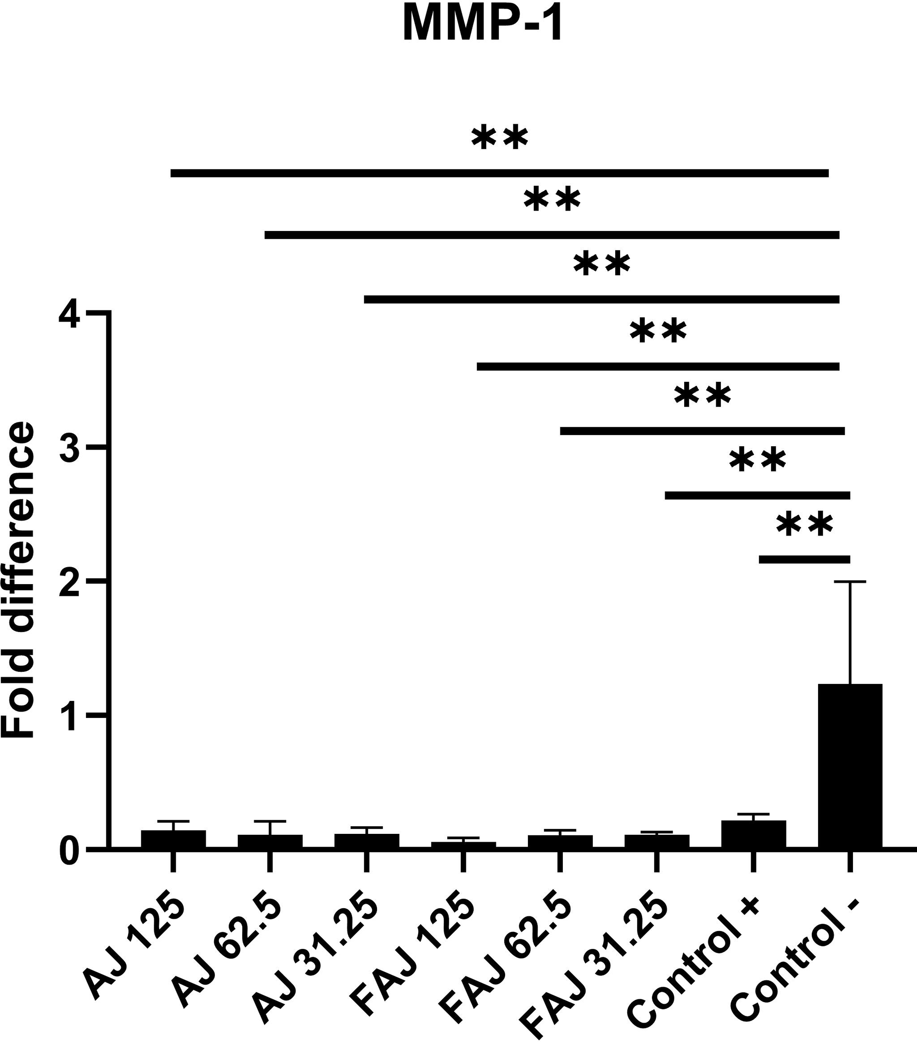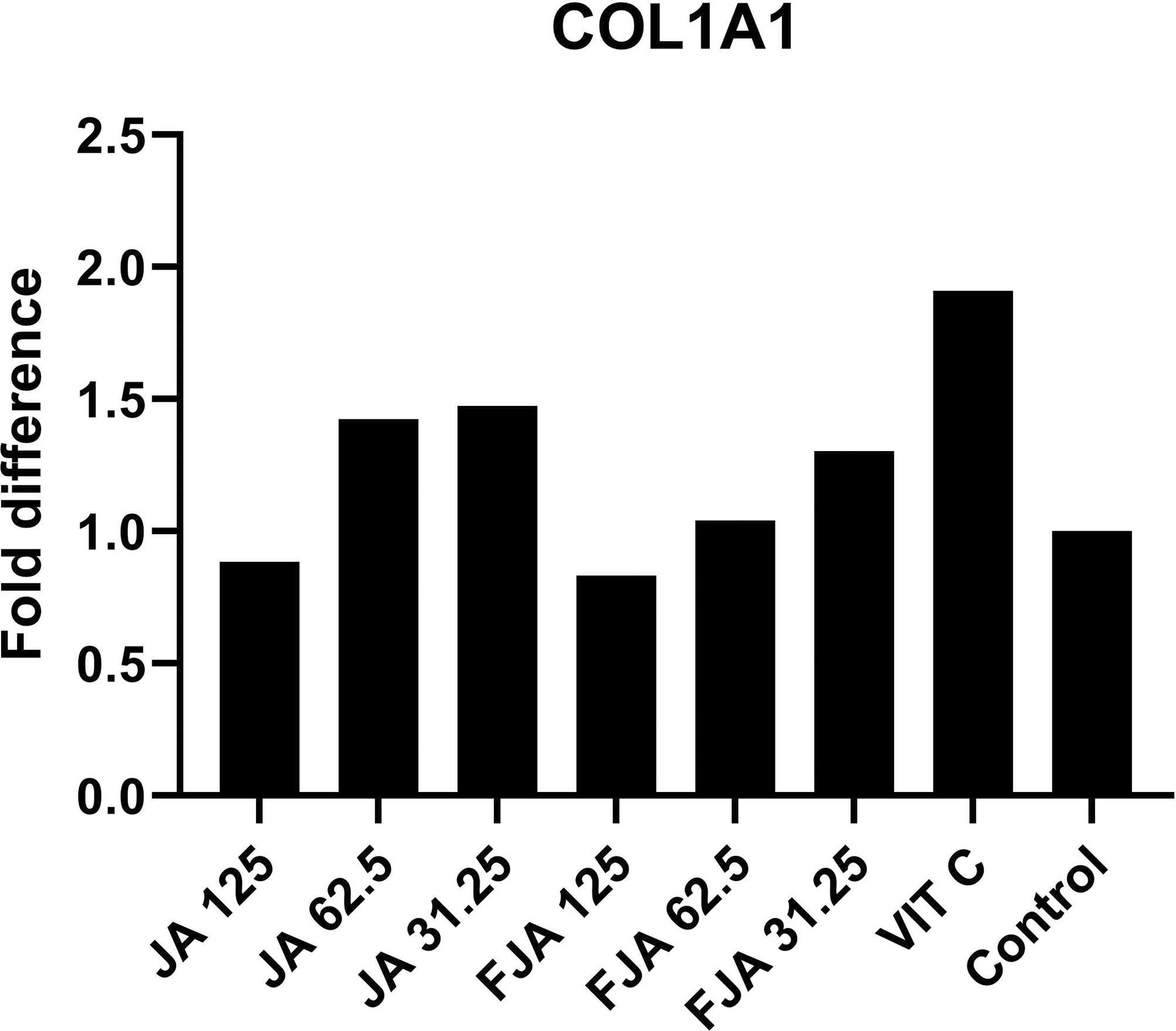 MMP-1 gene expression (Figure 3) in fibroblasts treated with FAJ and AJ at concentrations of 31.25, 62.5, and 125 μg/mL for 48 hours showed significant downregulation relative to that in the control (p < 0.05). MMP-1 levels in the FAJ group at concentrations of 31.25, 62.5, and 125 μg/mL decreased by 89.02%, 89.63%, and 94.6%, respectively, compared to the control group, whereas in the AJ group, it decreased by 88.62%, 91.2%, and 86.6%, respectively, compared to the levels of MMP-1 in fibroblasts not treated with any extract. There were no significant differences in MMP-1 levels between AJ and FAJ. COL1A1 expression (Figure 4) also exhibited a dose-dependent pattern, with higher concentrations of AJ and FAJ showing lower COL1A1 expression. COL1A1 levels in the FAJ group at concentrations of 31.25 and 62.5 μg/mL increased by 30% and 4%, respectively, compared to the control, whereas it decreased by 17% at a concentration of 125 μg/mL. In the AJ group, COL1A1 levels at concentrations of 31.25 and 62.5 μg/mL increased by 47% and 42%, respectively, compared to the control group, whereas it decreased by 12% at a concentration of 125 μg/mL. The changes in COL1A1 levels in both the AJ and FAJ groups were not statistically significant (p > 0.05).