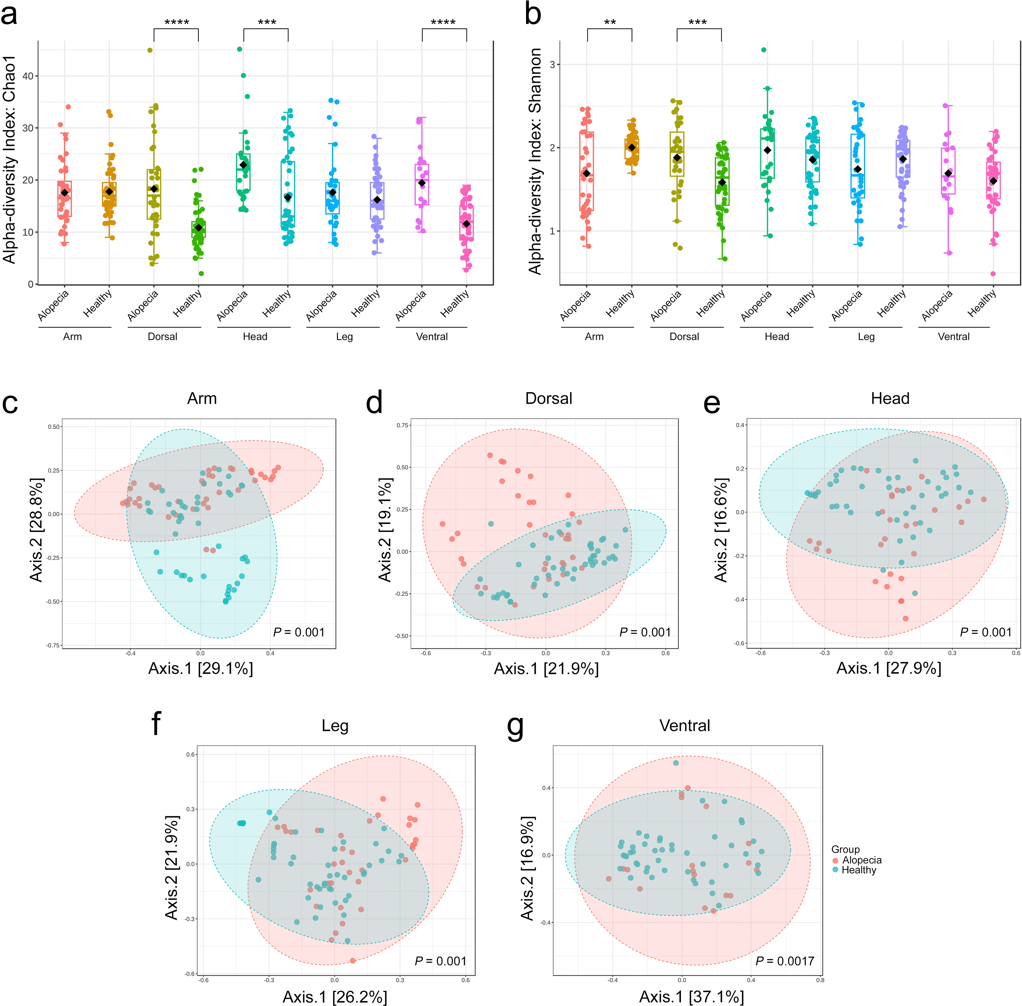 Alpha diversity comparisons across five body parts between healthy and alopecic macaques revealed statistically significant differences in the Chao1 and Shannon indexes (Kruskal-Wallis test) in Figure 1a and 1b. The Chao1 diversity index was significantly higher in the dorsal (P = 4.65 x 10−5), head (P = 5.53 x 10−4), and ventral (P = 4.39 x 10−5) areas of the alopecic group than in the healthy group. However, the Shannon diversity index of the alopecic group was significantly lower than that of the healthy group in the arm area (P = 8.45 x 10−3). Notably, the Shannon diversity index in the dorsal area of the alopecic group was significantly higher than the healthy group (P = 7.16 x 10−4). Beta diversity was significantly different between healthy and alopecic cynomolgus macaques in the arm (P = 0.001), dorsal (P = 0.001), head (P = 0.001), leg (P = 0.001), and ventral area (P = 0.017) in Figure 1c-1g.