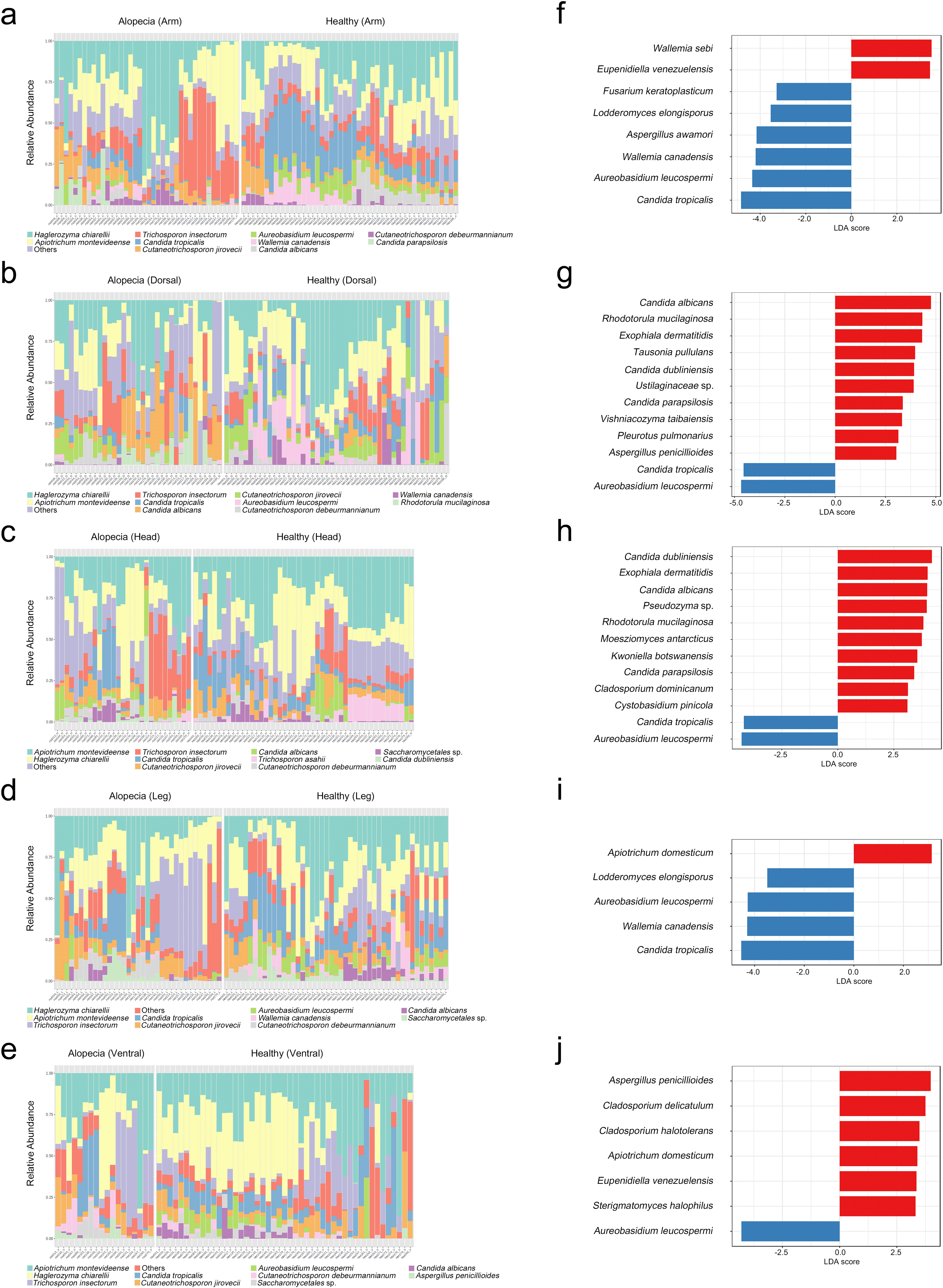 The taxonomic compositions of the skin fungi species in healthy and alopecic macaques are presented in bar graphs with the relative abundance (%). Different colored bars represented the different skin fungal taxa. LEfSe showed the most differentially abundant taxa in the five areas from alopecic (red) and healthy (blue) with the threshold of Linear discriminant analysis (LDA) score >3 and P < 0.05 (Kruskal-Wallis test). The bar graph showed a-b) arm, c-d) dorsal, e-f ) head, g-h) leg, and i-j) ventral areas.
