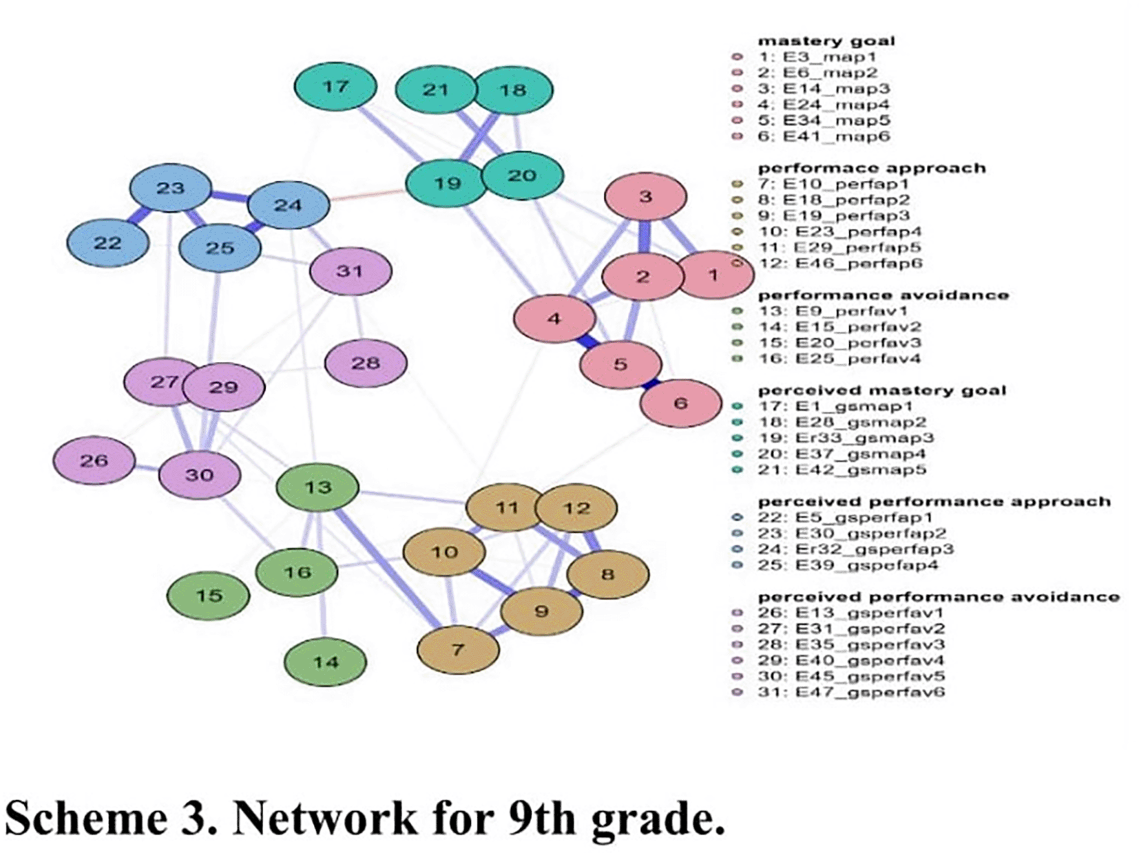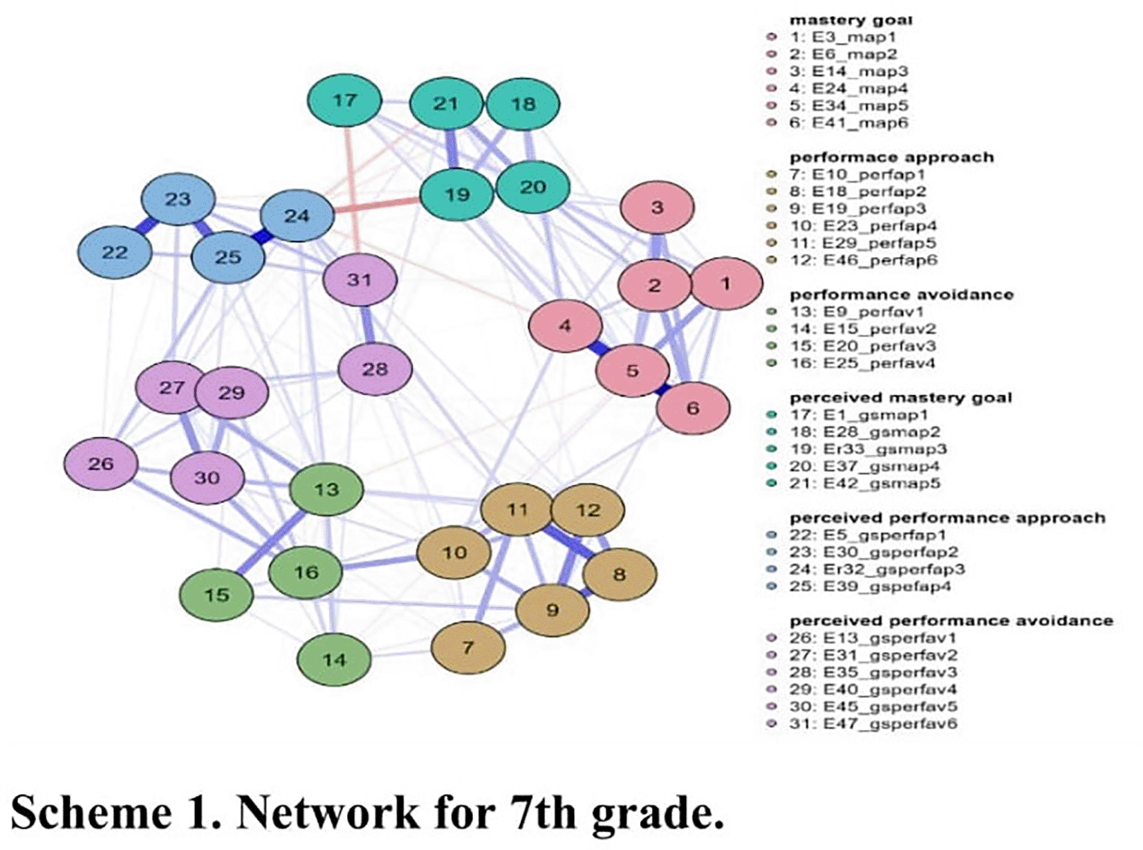 Three networks emerged from the data analysis, each corresponding to one grade of junior high school ( Figures 1, 2, and 3). The overall diagram of centrality measures is presented ( Figure 1). In more detail, and in terms of the structure of all three networks, with a gradual peak from 7th grade to 9th grade, is the distinction of the networks into two main sub-networks in addition to the individual groupings. More specifically, it appears that mastery goals and perceived mastery goals form one part, while the remaining performance goals and perceived performance goals form the other. This is based on the number and type of connections created between sets of nodes. Few weak and/or negative connections were observed between the nodes corresponding to perceived mastery goals and perceived performance-approach goals. The connections between the mastery goals and the remaining nodes were similar. However, this does not occur for perceived mastery goals.