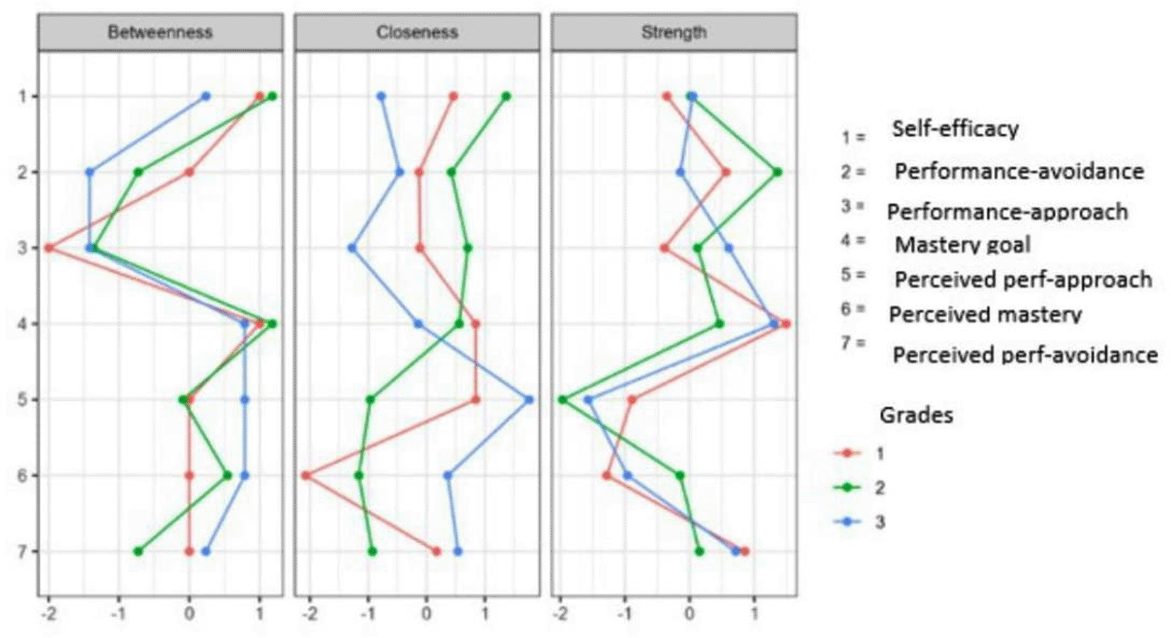 Finally, in the 9th grade’s network, the measure of strength highlighted mastery goals as the strongest node. However, the assessment of betweenness indicated that three out of the seven variables were the most important and equal: mastery goals, perceived mastery goals, and perceived performance-approach goals, while only perceived performance-approach goals stood out in closeness ( Figure 11). The centrality measures are represented in Figure 12.
