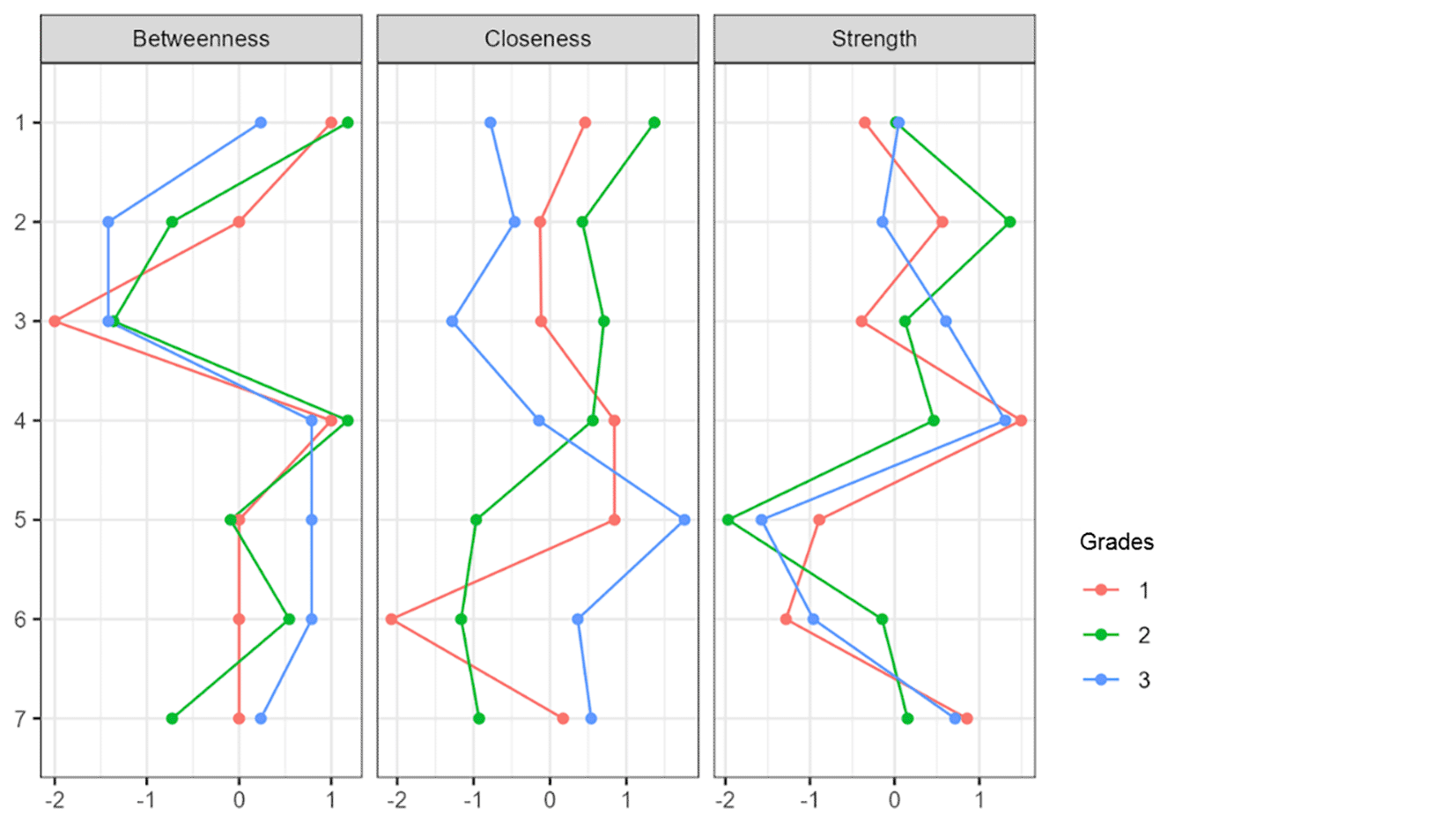 Data analysis was performed using JASP, focusing on the microscopic level of network analysis, which examines individual nodes to comprehensively address research questions. JASP is free and user-friendly statistical software that offers both frequentist and Bayesian analyses, making data analysis accessible to researchers at all levels. Centrality measures include strength, the sum of absolute edge weights directly connected to a node (Bringmann et al., 2019; Burger et al., 2022; Siew et al., 2019; Siew, 2020); closeness centrality, indicating a node’s connectivity within the network; and betweenness centrality, reflecting a node’s role as a bridge in the shortest paths (Letina et al., 2019; Siew, 2020). The local clustering coefficient, which assesses the interconnectedness of a node’s neighbors and proximity reciprocity, was also applied (Siew et al., 2019; Siew, 2020). These measures collectively capture various aspects of node positioning and their influence within the network.