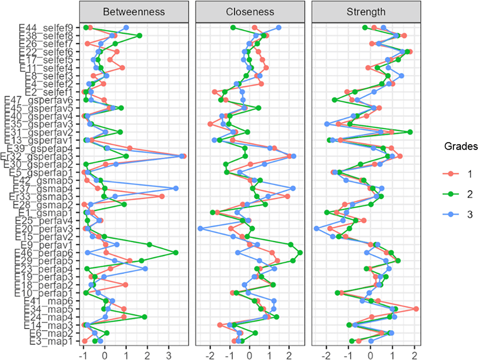 The measure of strength in 8th grade’s network estimates the performance-avoidance goals variable as the most central, while mastery goals and self-efficacy beliefs emerge equally in betweenness, which emerges as a stronger node in closeness as well ( Figure 10).