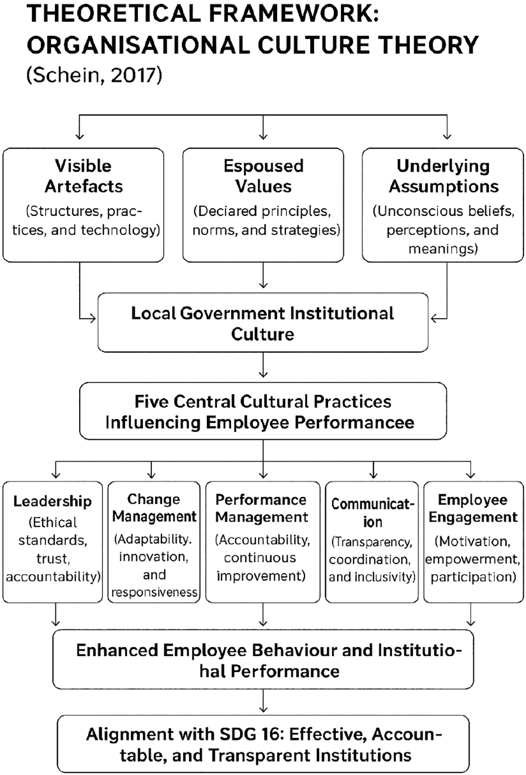 We observe that through the lens of Schein’s framework, these five interrelated cultural practices demonstrate that employee performance in local government is shaped less by external resources or individual capabilities and more by the internal cultural environment that guides behaviour, decision-making, and institutional responsiveness (Ortega & Acero, 2025; Rumbi & Christian, 2021). Strengthening these practices aligns with the principles of SDG16, promoting transparent, accountable, and effective governance (Amil, 2024, December). Consequently, the theory provides a systematic basis for understanding how leadership, adaptive change, robust performance management, inclusive communication, and active employee engagement collectively enhance local government performance, improve service delivery, and support sustainable development outcomes across diverse institutional contexts (Atisa et al., 2021).