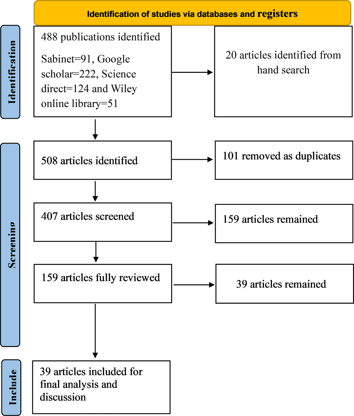 From the database search 488 articles were identified and an additional 20 articles were identified through hand search. Resulting in a total of 508 (Figure 1). A total of 407 articles remained after removing duplicates. After screening tittles and abstracts 159 articles remained and 39 met eligibility criteria and were included for full text review. After further consultation and screening no extra studies were added (Figure 1).