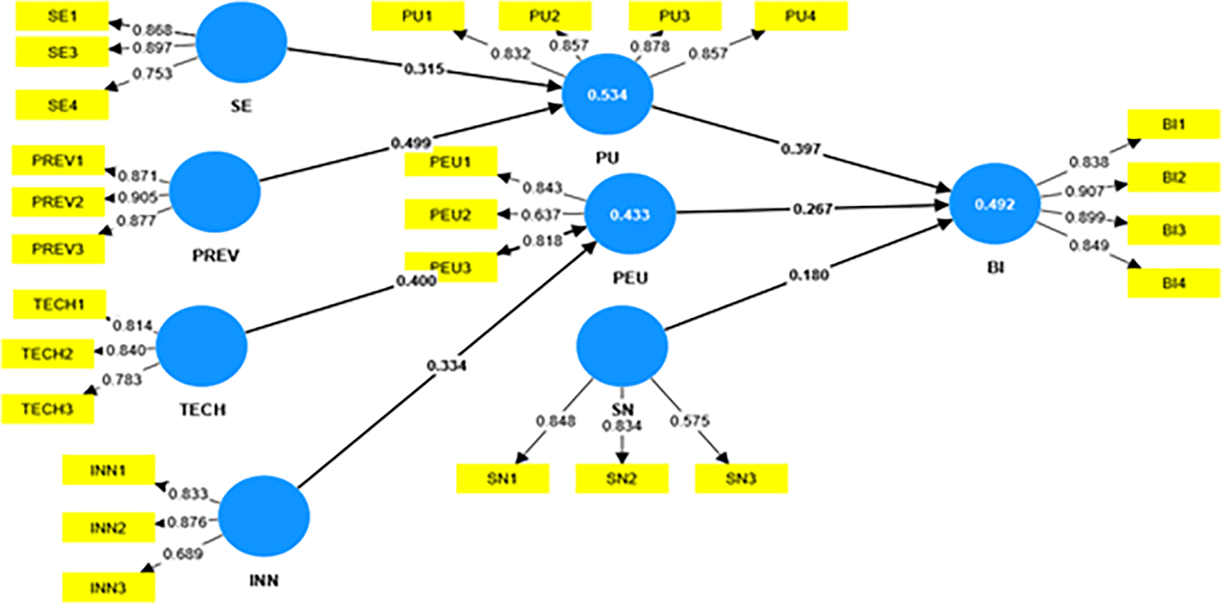 The path coefficient values of all the model constructs indicate stronger relationships as the values are above 0.10. The R2 value of Behavioural Intention (BI) is 0.492, which explains the predictive relevance of the model. The literature states that R2 values of 0.25, 0.50, and 0.75 for dependent variables denote the model’s weak, moderate, and substantial accuracy, respectively (Becker et al., 2012; Collier & Bienstock, 2006). Here, the R2 values of PU, PEU and BI are 0.534, 0.433 and 0.492, respectively, which proves the predictive relevance of the constructs in the model, confirming the research hypotheses of the study.
