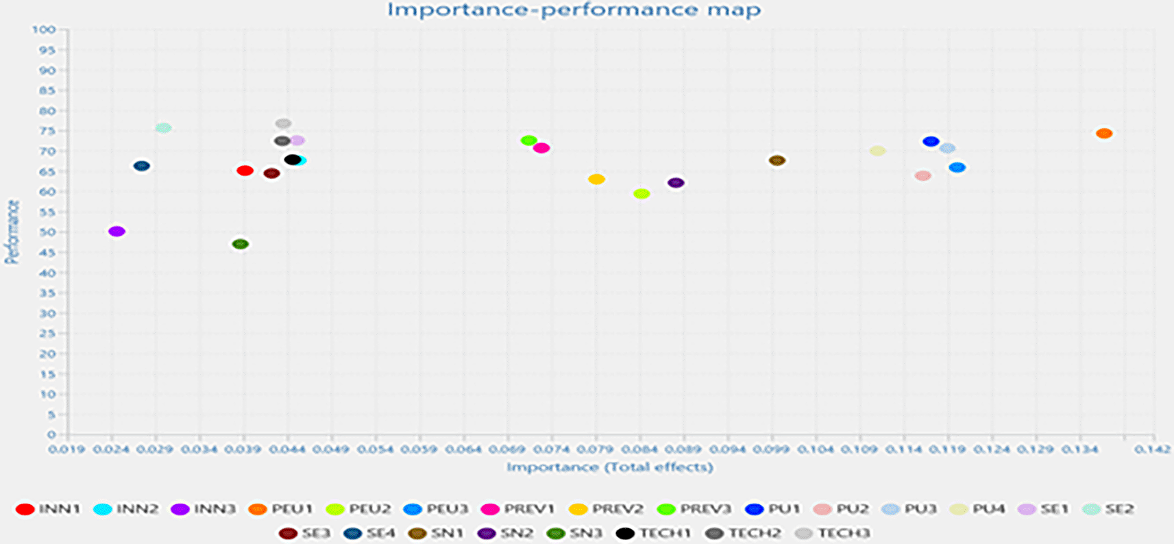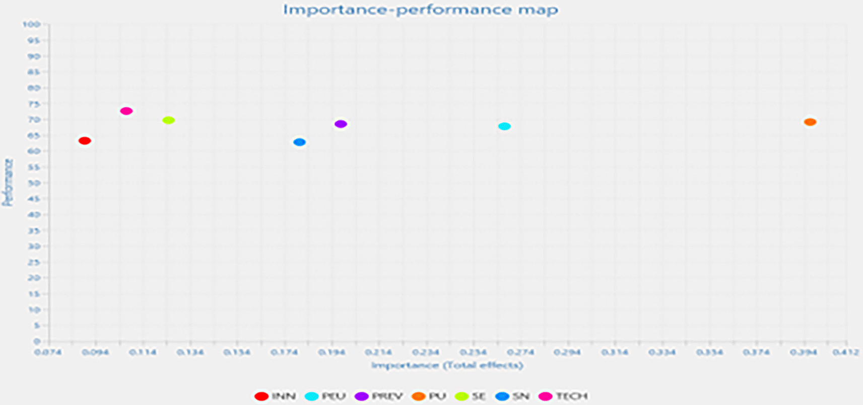 IPMA is performed to extend the results of PLS-SEM further. It helps to draw conclusions based on the performance and importance of each construct. Thus, it facilitates drawing inferences on two dimensions, importance and performance, to provide administrative implications (Hair et al., 2017). Hence, IPMA is done to help the target construct BI adopt smart technologies at both construct and indicator levels. The x-axis displays the total effects of the independent variables on the target construct. The y-axis displays the independents’ average construct scores or performance (Hair et al., 2014). The construct level IPMA results are shown in Figure 3.