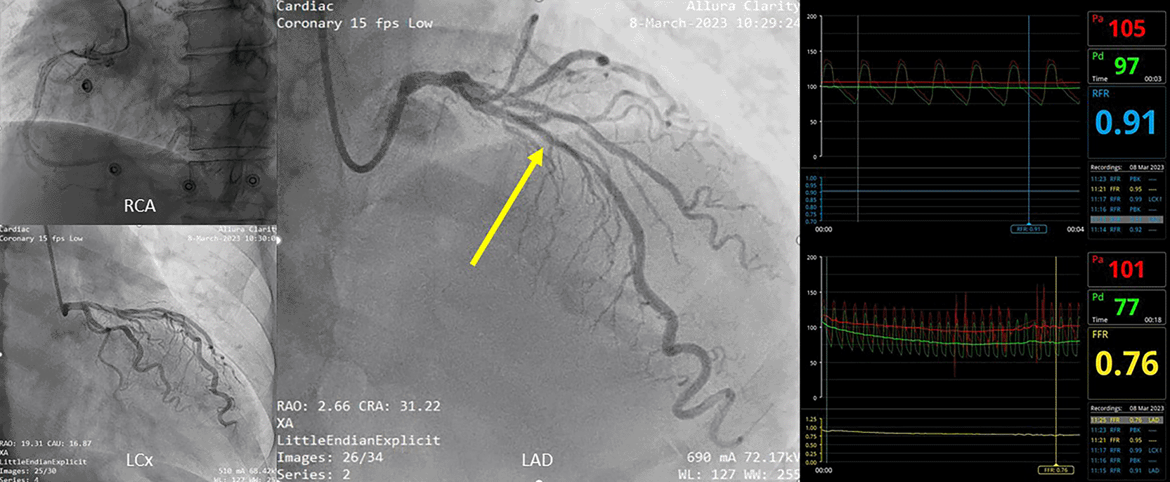 The coronary angiography revealed diffuse and heavily calcified lesions extending from the proximal to middle left anterior descending (LAD) artery with 75% stenosis at the proximal segment. The left circumflex artery (LCx) showed a non-significant lesion and the right coronary artery (RCA) appeared normal. We proceeded with a physiological assessment using the resting full-cycle ratio (RFR) and showed a negative result of 0.91. While the confirmatory fractional flow reserve (FFR) showed a significant lesion of 0.76 ( Figure 1).