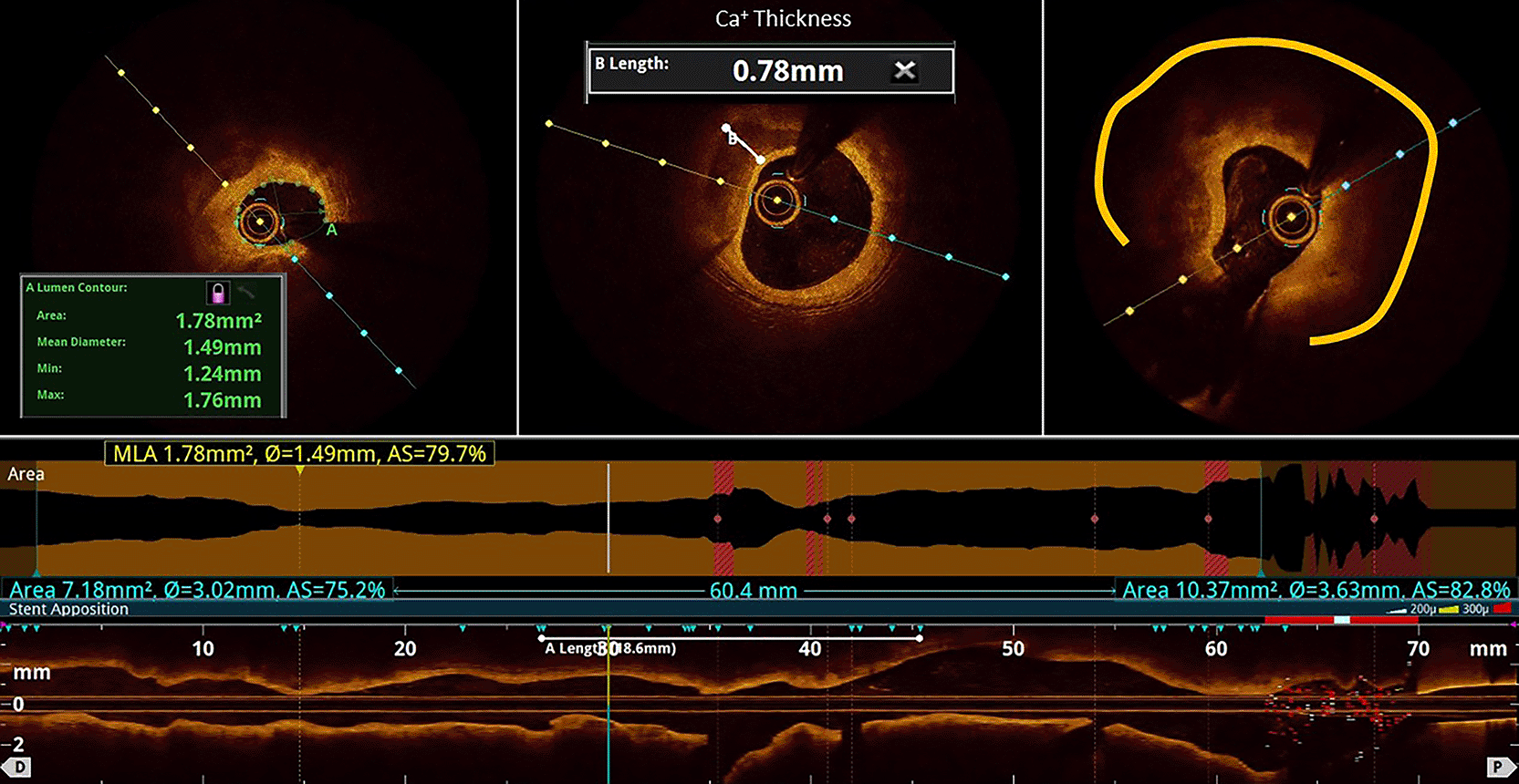 OCT has become more essential in PCI planning due to its ability to produce high-resolution visualization of calcium morphology, including calcium circumferential arc, thickness, and length. A study concluded that calcified lesions with a circumferential arc >180°, maximum thickness >0.5 mm, and length >5 mm are associated with poor stent expansion.10 Our patient had a lesion arc of 270°, a maximum thickness of 0.78 mm, and a length of 64 mm. Based on these characteristics, the stent expansion would be suboptimal. Therefore, aggressive calcium modification techniques such as atherectomy are required.