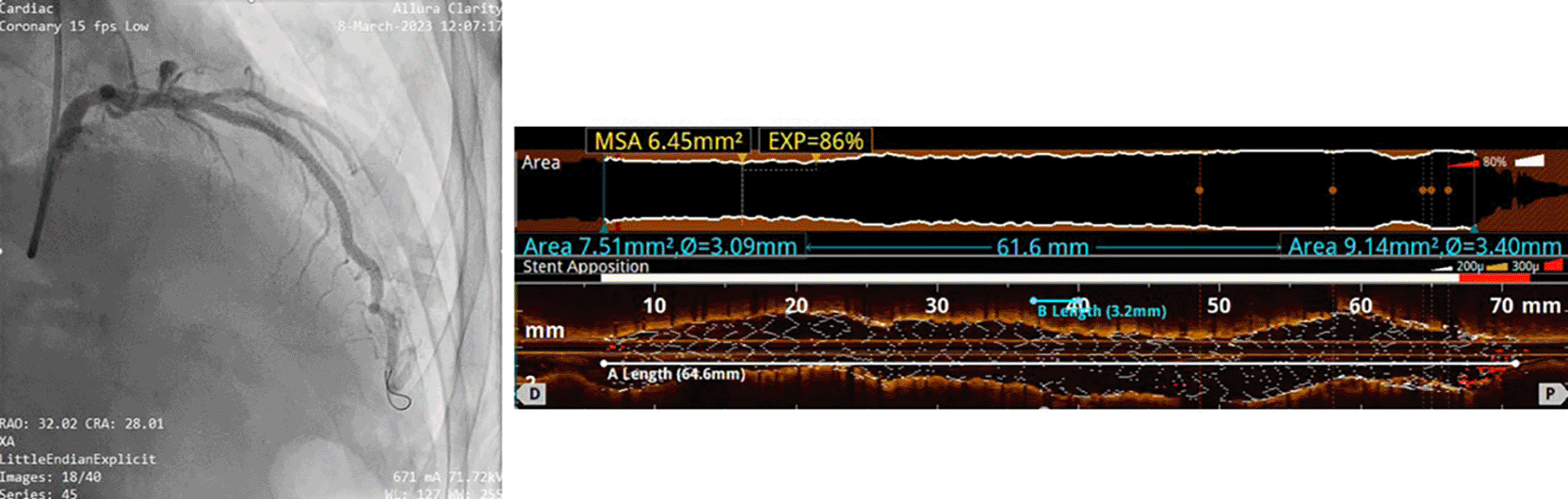 The first stent was deployed to mid-distal LAD using DES Xlimus 3.0 x 32 mm at 14 atm, followed by the second stent to proximal-mid LAD using DES Angiolite 3.5 x 34 mm at 18 atm. Evaluation angiography was adequate with TIMI flow grade 3. The evaluation OCT confirmed optimal stent apposition and expansion (MLA of 6.45 mm2) without any medial edge dissection ( Figure 3).