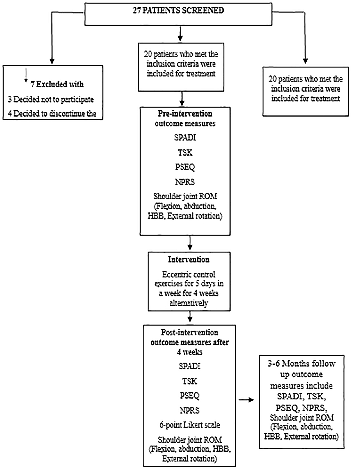 The outcome measures include Shoulder Pain Arm and Disability Index (SPADI).11 Tampa scale of Kinesiophobia (TSK),12 Joint ROM using Mobile Inclinometer,13 Numerical Pain Rating Scale (NPRS),14 Pain self-efficacy questionnaire15 and 6-point Likert’s pain satisfaction scale.16